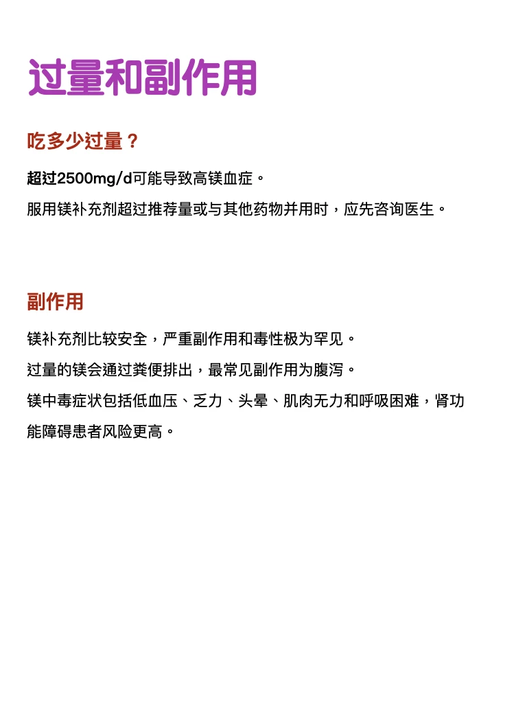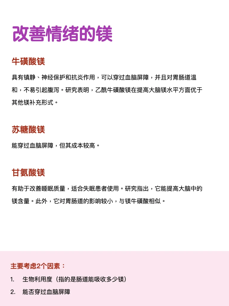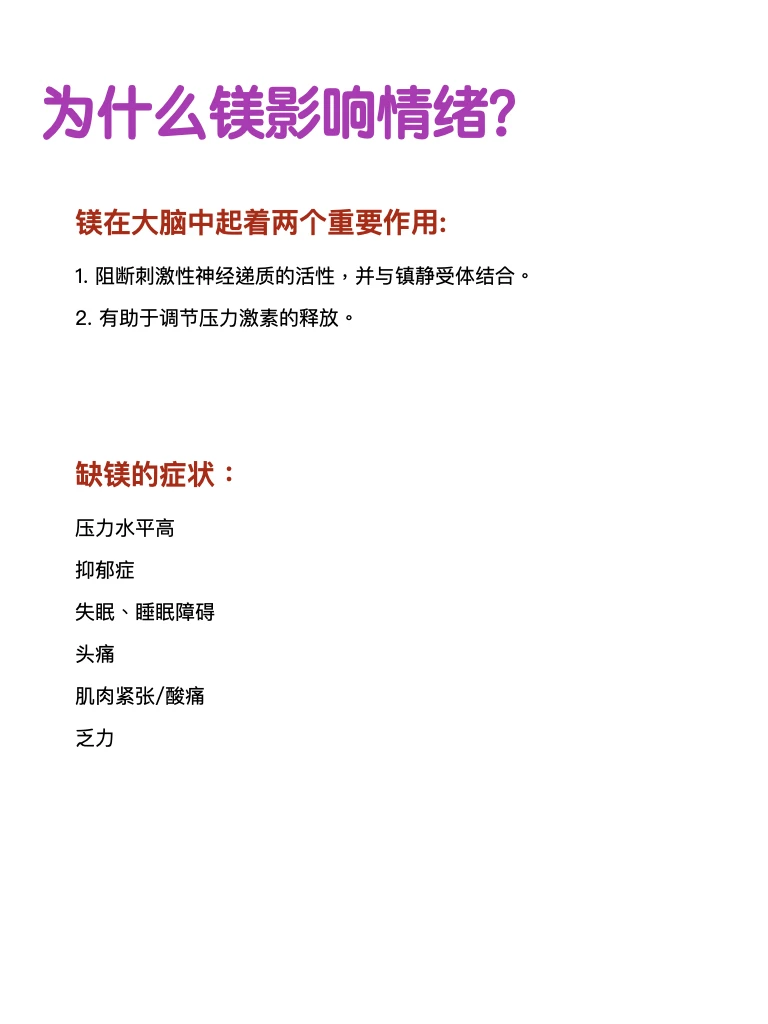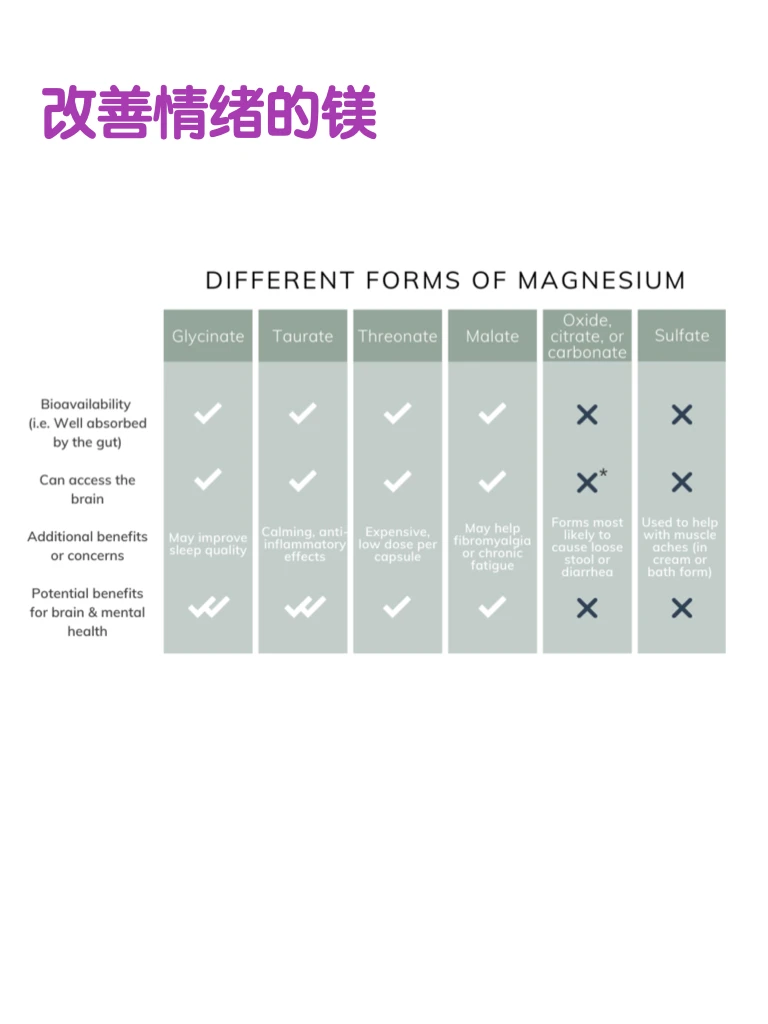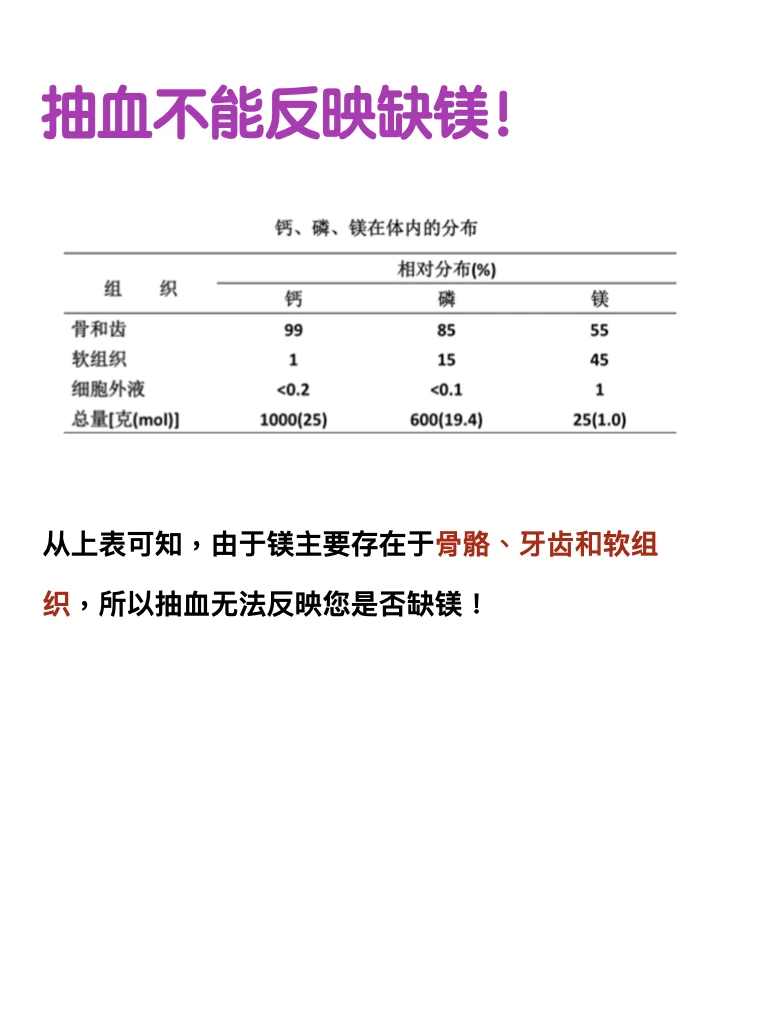 抽血测镁并不能反映你缺不缺镁哦,因为镁主要存在于骨头、牙齿和软组织,在血液里只有1%。 如何选择镁的补充形式?可以考虑通过血脑屏障以及在肠道好吸收的镁。 补镁还要注意补钙,钙镁比例大概是2:1-3:1。而且最好分开补,比如午餐后吃镁,晚餐后吃钙。