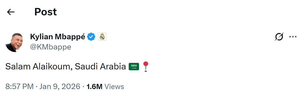 抵达吉达后,姆巴佩也在社交媒体上发文写道:“你好,沙特阿拉伯”随后,他前往红海沿岸的吉达希尔顿酒店,与球队大部队会合。他将于本周六在吉达与队友们一起训练,目标是与巴塞罗那的西超杯决赛。