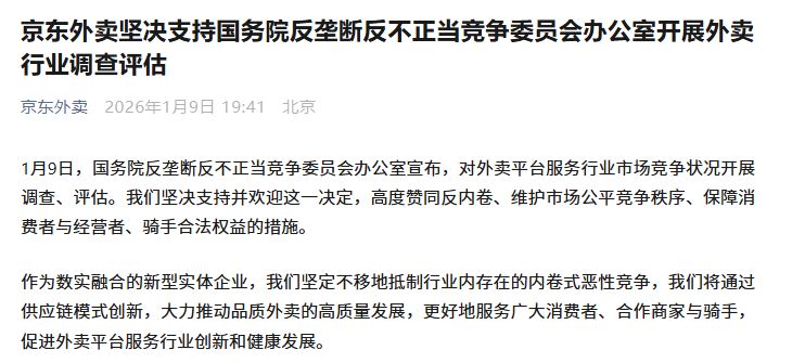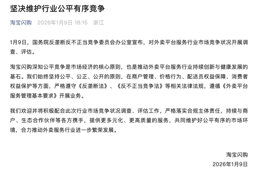 1月9日,国务院反垄断反不正当竞争委员会办公室宣布,对外卖平台服务行业市场竞争状况开展调查、评估。美团、淘宝闪购、京东外卖均表示积极配合。
