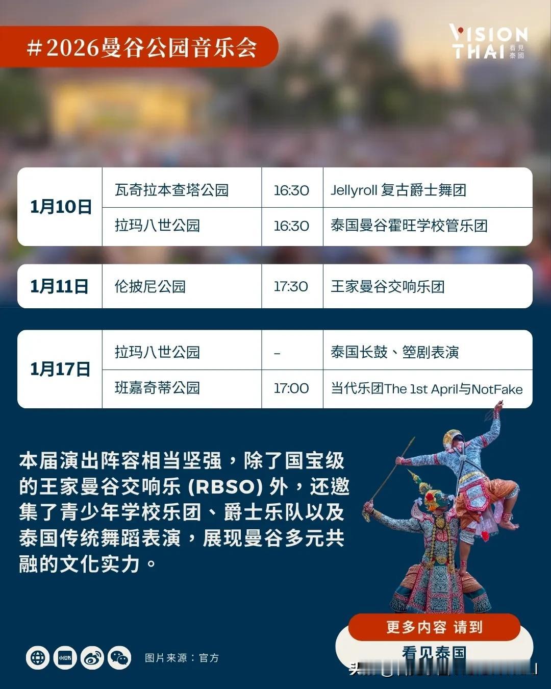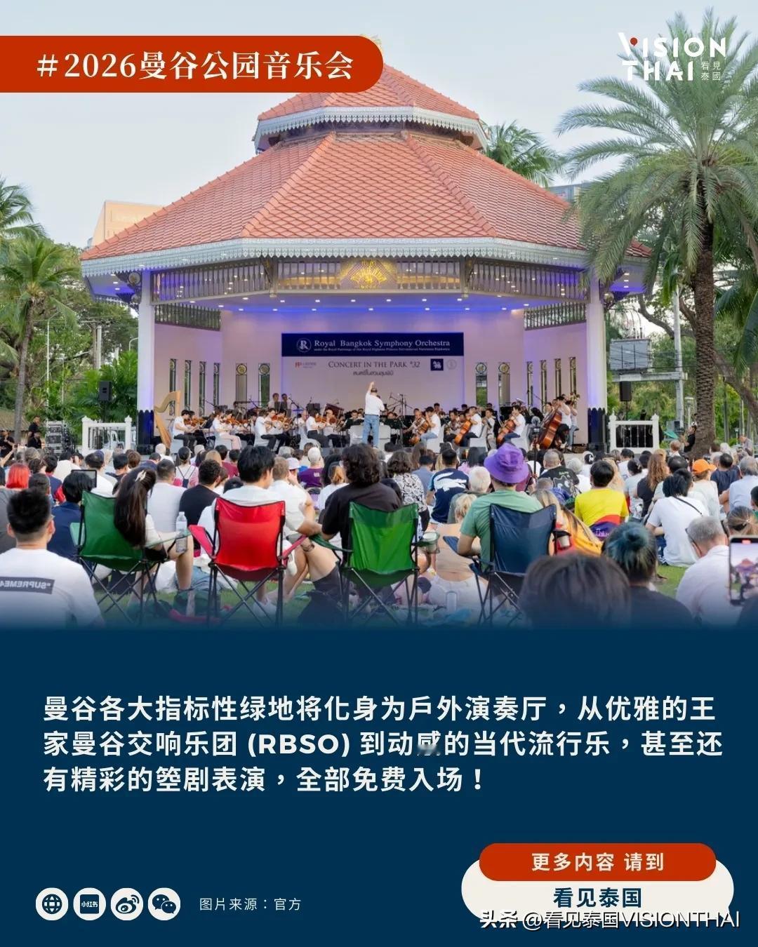 【2026曼谷公园音乐会来了!1月周末免费听国宝级交响乐、箜剧表演】 1月周末推荐参加曼谷公园音乐会!曼谷市政府 (BMA) 近日正式宣布,深受市民与游客喜爱的「公园音乐会」(Music in the Park) 在2026年1月全面回归。整个月份的周末,曼谷各大指标性绿地将化身为户外演奏厅,从优雅的王家曼谷交响乐团 (RBSO) 到动感的当代流行乐,甚至还有精彩的箜剧表演,全部免费入场! 曼谷公园变身文化枢纽 1月音乐活动不间断 为了提升城市艺文气息,曼谷市政府今年再度扩大举办「公园音乐会」系列活动。这项计划旨在让民众能轻松亲近艺术,活动地点选在交通便利的伦披尼公园 (Lumphini Park)、班嘉奇蒂公园(Benjakitti Park) 及拉玛八世公园 (Rama VIII Park)。 本届演出阵容相当坚强,除了国宝级的王家曼谷交响乐团 (RBSO) 外,还邀集了青少年学校乐团、爵士乐队以及泰国传统舞蹈表演,展现曼谷多元共融的文化实力。 * 1月10日(周六): * 瓦奇拉本查塔公园(Vachirabenjatas Park):16:30 Jellyroll 复古爵士舞团 * 拉玛八世公园(Rama VIII Park):16:30 泰国曼谷霍旺学校管乐团 * 1月11日(周日): * 伦披尼公园 (Lumphini Park):17:30 王家曼谷交响乐团 (RBSO) 招牌落日演奏 * 1月17日(周六): * 拉玛八世公园(Rama VIII Park):欣赏极具震撼力的泰国长鼓表演(Long Klong Yao),以及国宝级箜剧(Khon)表演。 * 班嘉奇蒂公园 (Benjakitti Park):17:00 起由当代乐团The 1st April与NotFake接力演出。 推荐一月的周末到曼谷公园散步、参加免费音乐会,感受泰式艺文氛围!更多活动详情与即时时程请关注曼谷市政府(BMA)官方公告。 原文:-hans/article/music-in-the-park-bangkok-2026/ 看更多:-hans/