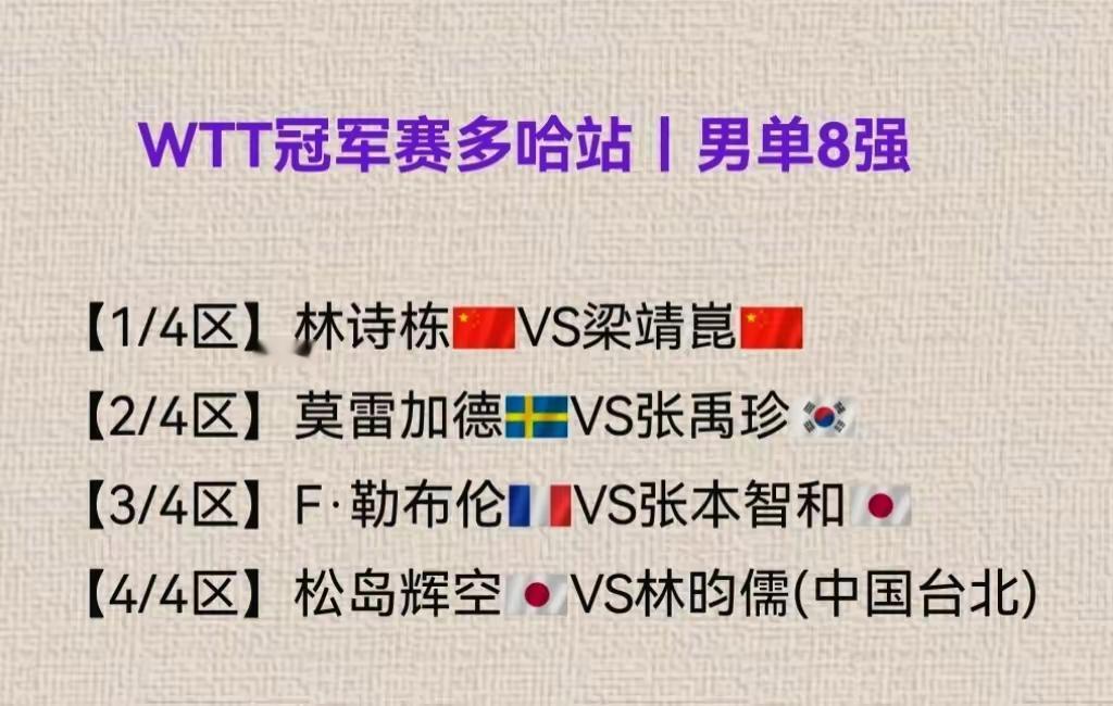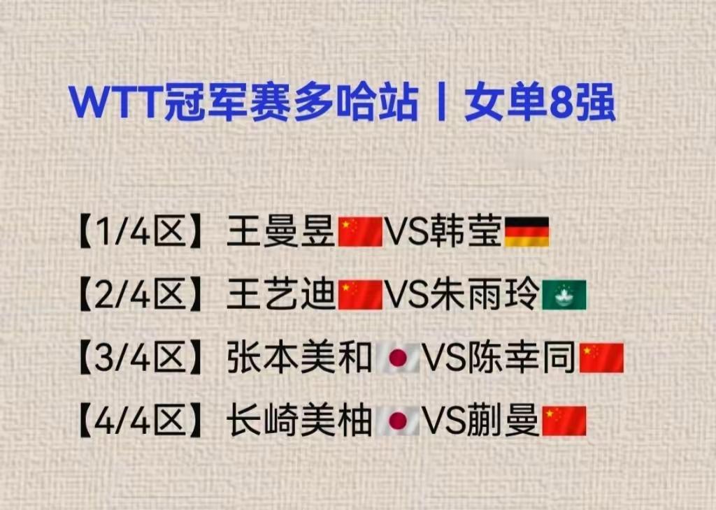 多哈冠军赛今天是8进4的比赛 8强国乒女队占了4强[赞][赞] 希望能包揽4强加油。 让陈熠好好看看你曼昱姐怎么打韩莹,蒯曼对长崎美柚不好打,两个人都是左手,长崎美柚虽然是递补参赛,她更加珍惜机会更努力拼搏,先赢伊藤美诚,又赢了德国的温特,温特改变了打法赢过陈幸同,长崎能赢她说明长崎很厉害了。 蒯曼要做好困难准备,努力拼搏加油加油。