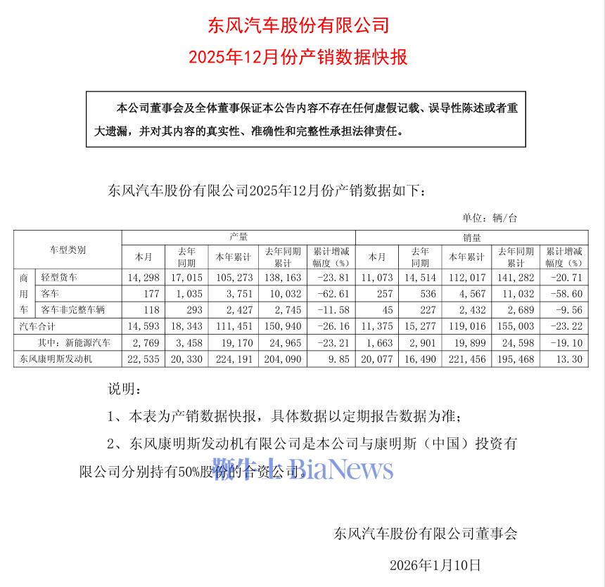 公告显示,2025年12月新能源汽车产量为2769辆,同比下降19.89%;2025年全年新能源汽车累计产量为19170辆,同比下降23.21%。