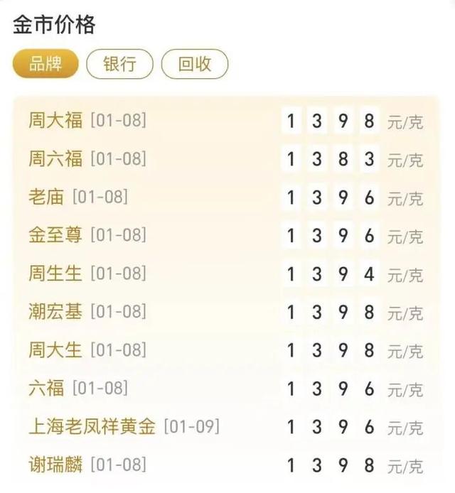 9日,各大金饰品牌的实时报价再次接近1400元/克。比如周大福、潮宏基、周大生、谢瑞麟的报价为1398元/克。其他品牌报价从1383元/克至1396元/克不等。