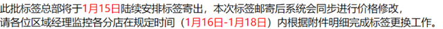 根据1月6日潮宏基总部发给门店的邮件,新标价签将于1月15日陆续安排标签寄出,同时系统更新到最新价格,并要求门店将在规定的1月16日至18日期间完成标签更换工作。