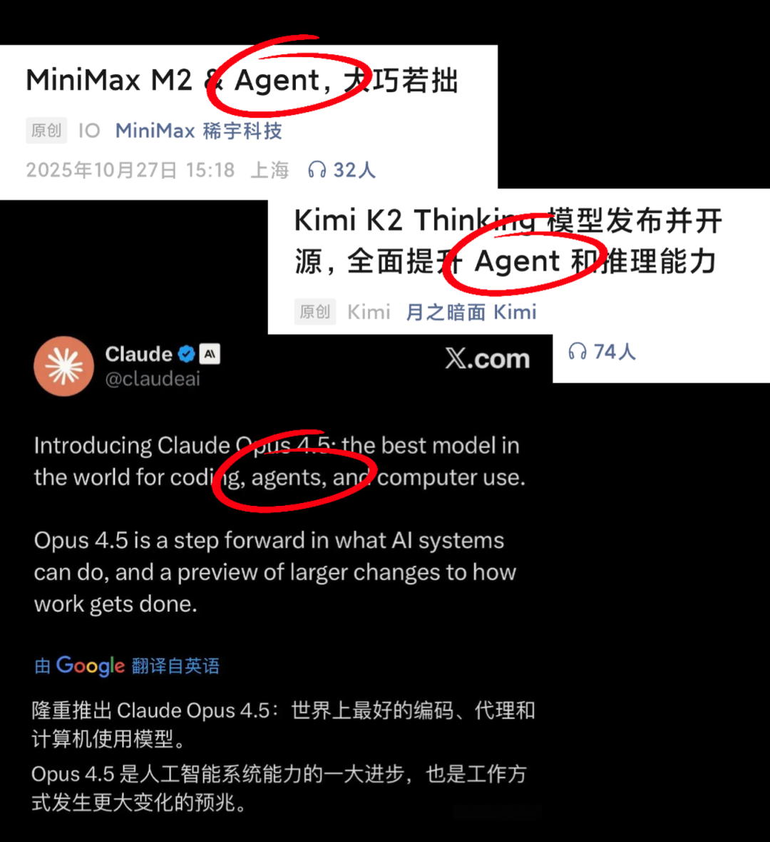 首先是AI大模型的又一次重大突破,那便是“模型即Agent”的架构升级。所谓“模型即Agent”,即在模型中内置任务多步骤拆解、推进与工具调用的能力。其目的自然是让AI能够处理更加复杂、庞大的任务。10月27日,Minimax-M2发布;11月6日,Kimi-k2-Thinking发布;11月18日,Grok4.1发布;11月24日,ClaudeOpus4.5发布。从这些产品的发布宣传中,都开始突出其自主调用工具处理复杂任务的Agent能力。
