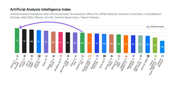 然而,这一切随着11月18日Gemini3.0Pro发布后,局面发生了变化。Gemini3.0Pro以大幅度领先的姿态刷榜各大测评集,第一次以全面领先的姿态超越了一周前发布的ChatGPT5.1。