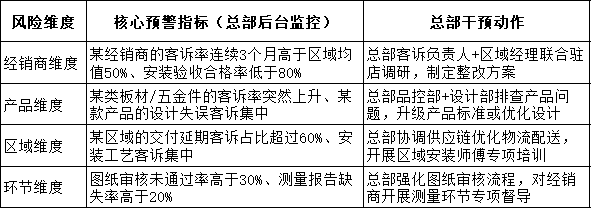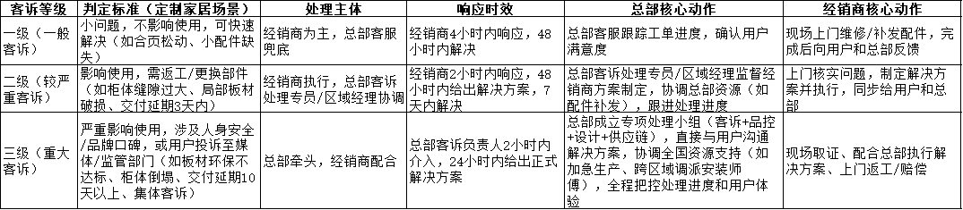 增值服务补偿:针对二级/三级客诉用户,总部统一制定增值服务补偿方案(如免费延长全屋质保期、免费上门除甲醛、赠送家居保养服务),由经销商落地执行,费用由总部与经销商分摊;