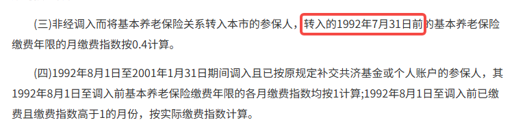 “转入的1992年7月31日前的基本养老保险缴费年限的月缴费指数按0.4计算。”