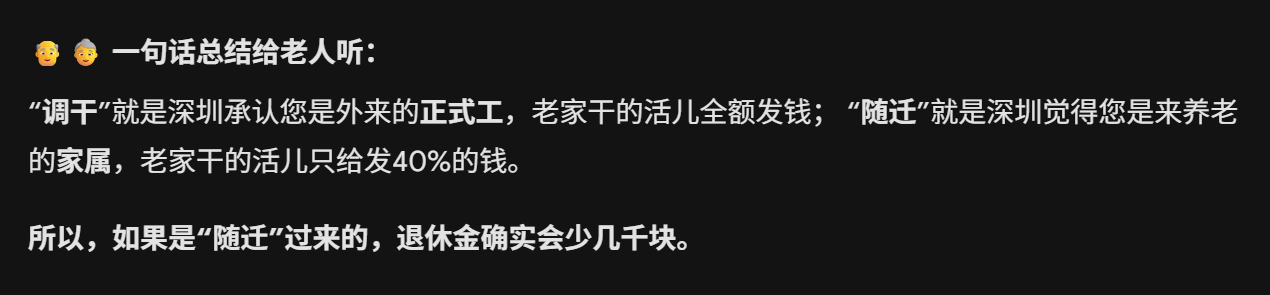 刚好手边开着电脑,我就顺手打开Gemini3Pro帮他查了一个很具体的业务问题:“听说深圳随迁的户口跟调干的户口退休待遇差很多,是真的么?有没有明确政策?我是小白,请用最直白的话告诉我。”
