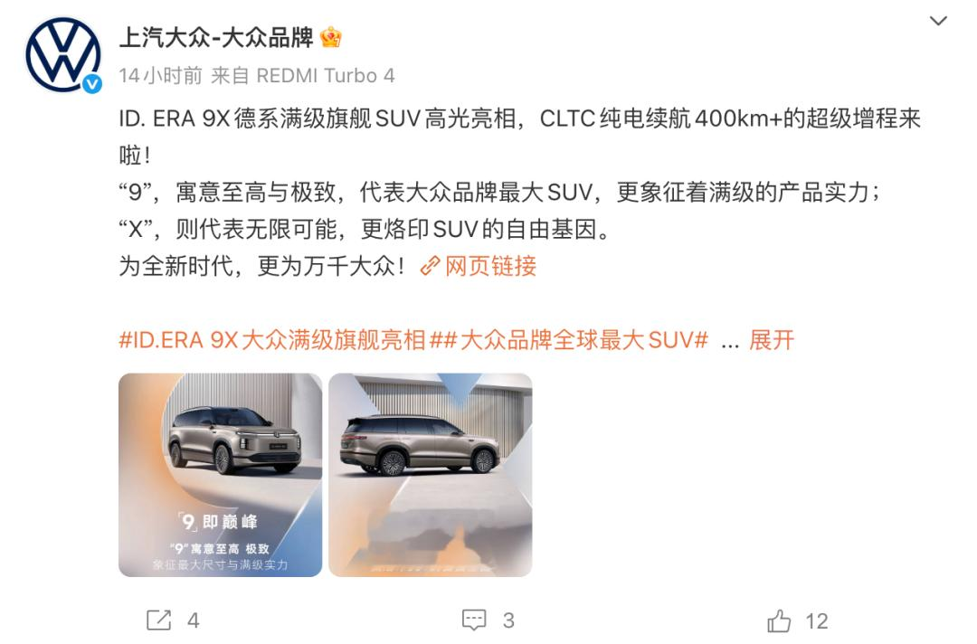 上汽大众ID.ERA9X是上汽大众乃至大众汽车中国推出的首款增程SUV,定位大型增程SUV,未来量产后将成为上汽大众尺寸最大的车型。从时间线来看,上汽大众ID.ERA概念车于2025上海车展前夕发布,2025广州车展上宣布全新新能源产品序列定名为ID.ERA,2026年上汽大众预计推出六款新能源产品,包括2款增程动力车型,3款PHEV车型以及1款纯电车型,ID.ERA序列将推出多款纯电、混动、增程产品,其中大众ID.ERA9X将是大众首款9系车型。