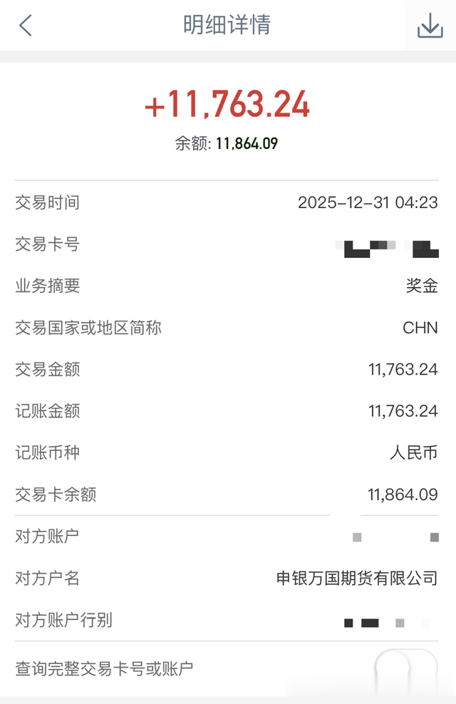 他提供的账单明细详情页显示,2025年12月31日,他收到来自申万期货的一笔转账,金额为11763.24元,业务摘要为“奖金”。