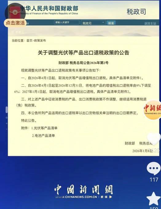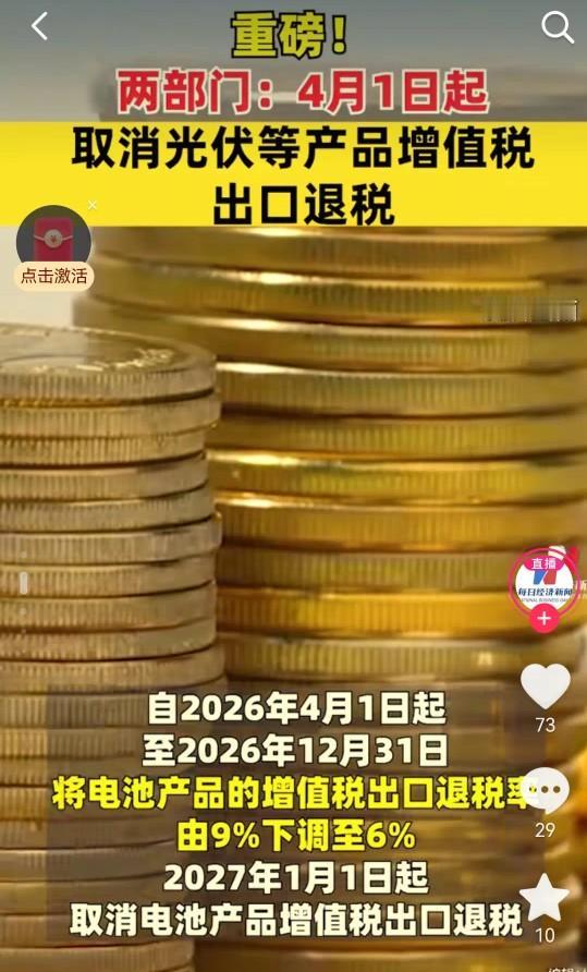 国家一纸令下,光伏电池出口退税彻底断了! 4月1日起,光伏产品出口增值税退税直接清零,电池产品税率也分两年(2026年4月降到6%,2027年1月归零)。简单说,国家不想再当冤大头,用咱的退税补贴外国人了! 企业现在玩命加班生产,赶在4月前能出多少出多少,因为客户知道后面要涨价!更狠的是利润,一块主流光伏板利润直接“腰斩”,不少靠退税吊命的小厂,尤其技术落后的电池厂,怕是要撑不住先倒一批。 长远看,国家是逼行业“断奶”练真功: 以前大家拿退税打价格战,低价抢单,结果便宜了老外还惹一身反倾销官司。现在退税没了,逼着你拼技术、控成本、提质量,没真本事的小厂出局,龙头通吃市场。同时倒逼企业加速去海外建厂,搞“本地生产本地卖”,绕开贸易壁垒。 说到底,中国光伏电池已经是世界老大,该凭硬实力赚钱了!省下的退税补民生不香吗?这一刀下去,行业阵痛难免,但“虚胖”不如“精瘦”,是时候靠实力说话了!光伏电池关税 光伏出口税