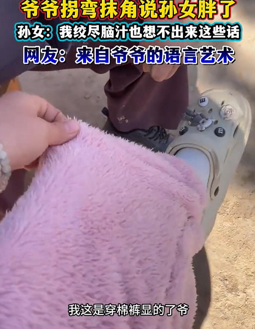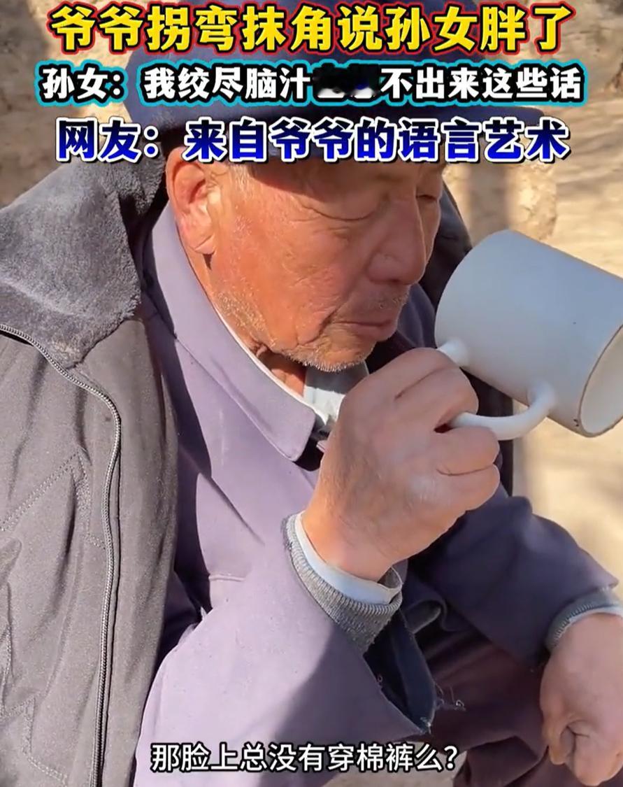 甘肃一个孙女和爷爷在院子里晒太阳,她穿了条厚睡裤,爷爷瞅了瞅说:“你胖了点吧?”孙女赶紧解释,是裤子显胖。 结果爷爷端起茶杯喝一口,淡淡回了一句:“那你脸上也没穿棉裤,咋也圆了呢?” 孙女当场愣住,下一秒笑得直不起腰,伸手就把爷爷帽子给扒了。爷爷也不恼,慢悠悠继续晒太阳。 这事后来被她发上网,网友都说这话太损了,找茬都找不到这种角度。可话难听吗?其实不,就是家里老一辈那种特有的玩笑方式。 嘴上说着你胖了,转头可能就给你整碗热汤面。他们不会讲大道理,关心就藏在这些唠叨里。 孙女自己也说,换别人这么说早生气了,但爷爷讲完,只觉得亲近。