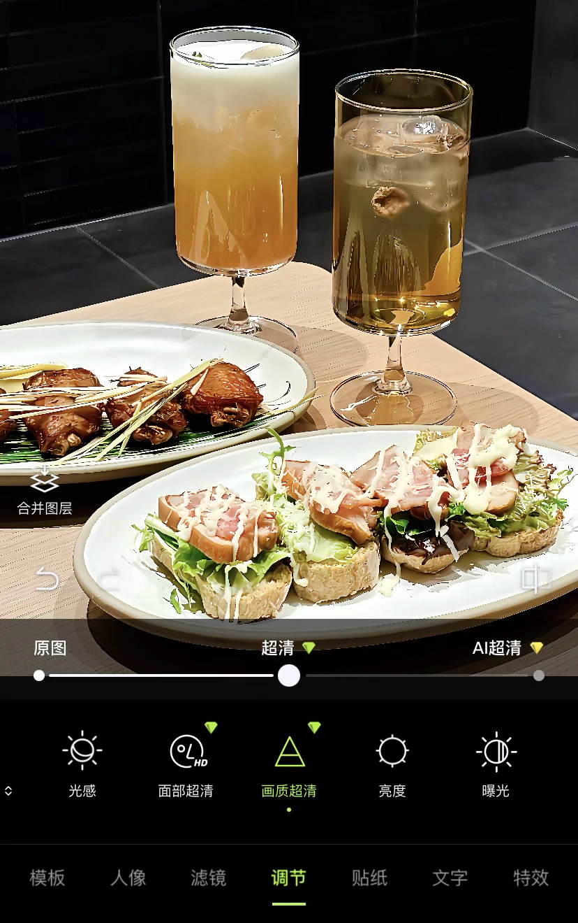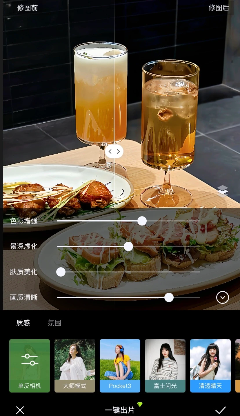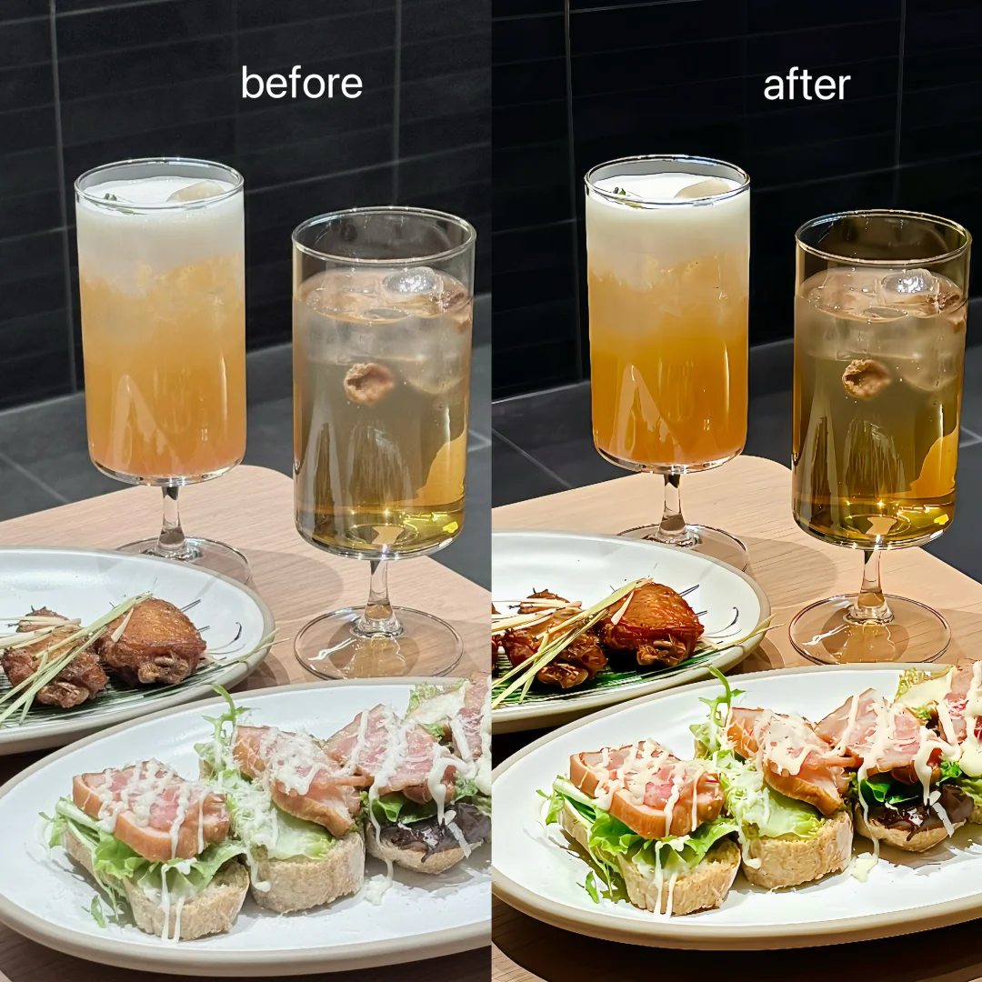 早早到餐厅的好处就是可以选位置[萌萌哒R] 虽然吃完餐厅也只有我们这一桌[笑哭R] 但不得不说这个清透发光的暗滤镜真的好适合晚餐🍷 💛拍摄技巧: 1️⃣拍摄时拉低一点点曝光 2️⃣不会构图就直接2-3倍焦距拍摄 3️⃣摆放上可以把餐品都推到干净背景的桌角拍摄 4️⃣菜品在摄像头前需要交错放置 5️⃣摆放上饮品高的这些放后面 💛拍摄: iPhone16 💛滤镜: 滤镜-质感-高级棕 (加个10-20就行 主要是提升一点高级的质感) 曝光-5 光感-25 阴影-10(主要是将背景颜色变黑) 高光-10(会有一点黄昏感) 对比度+5 锐化+40 参数不是固定的 根据实际情况调整 大家注意数据高一点的参数即可 也可以试试一键出片👌 💛质量修复: 针对锐化过后建议用一到两次质量修复 质量修复后图片会比较清晰柔和 ~~~~~~~~ ❤️主页会持续更新构图和滤镜❗️