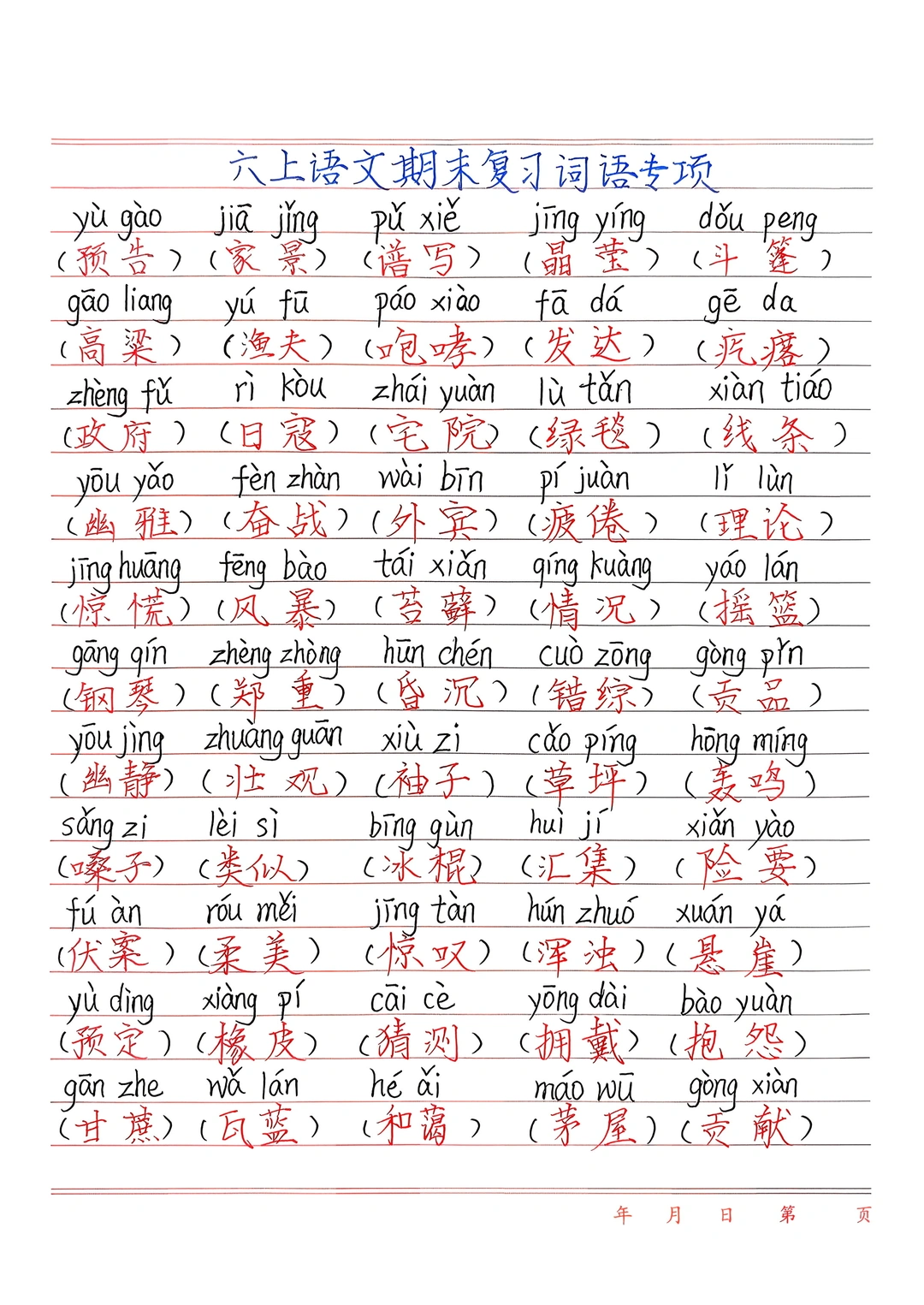 5. 习作:不用写整篇,重点练写人、记事、写景的片段,记2个万能开头结尾模板(如引用诗句、总结抒情),积累人物动作、语言描写素材。