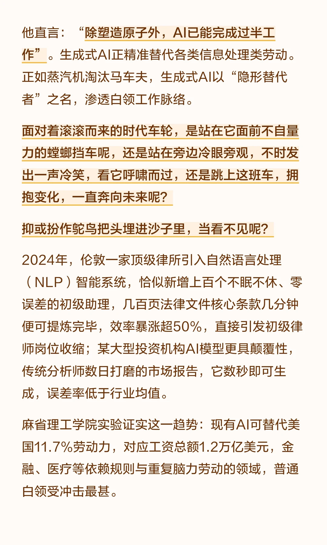 他直言:“除塑造原子外,AI已能完成过半工作”。生成式AI正精准替代各类信息处理类劳动。正如蒸汽机淘汰马车夫,生成式AI以“隐形替代者”之名,渗透白领工作脉络。