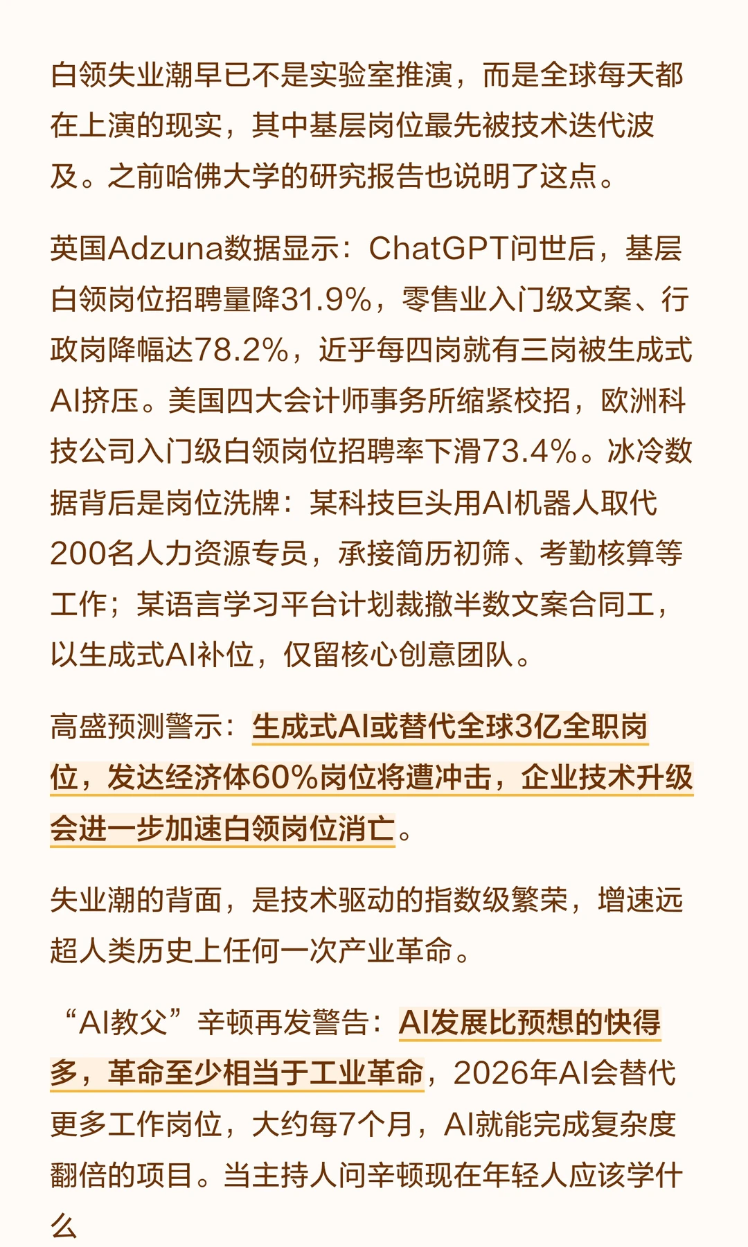 白领失业潮早已不是实验室推演,而是全球每天都在上演的现实,其中基层岗位最先被技术迭代波及。之前哈佛大学的研究报告也说明了这点。