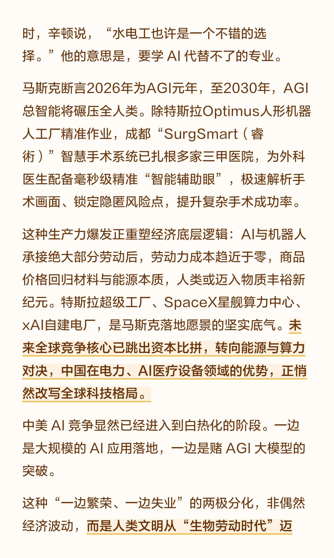 2026年初,埃隆·马斯克对技术时代走向作出预判:“AI和机器人是‘超音速海啸’,未来3到7年过渡期将异常颠簸。”他的话点透文明跃迁的核心矛盾:技术催生的物质繁荣,正与劳动力市场的崩塌式重构同步发生,白领群体首当其冲。