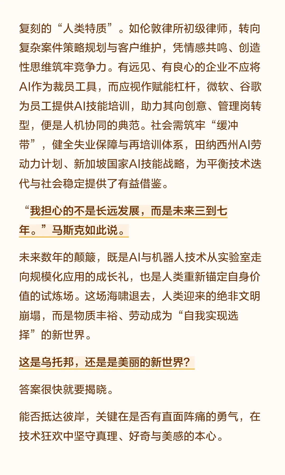换句话来讲,AI 和机器人发展速度超乎想象,未来 3 到 7 年是最艰难的,一边极度繁荣,一边失业;一边是火焰,一边是海水。