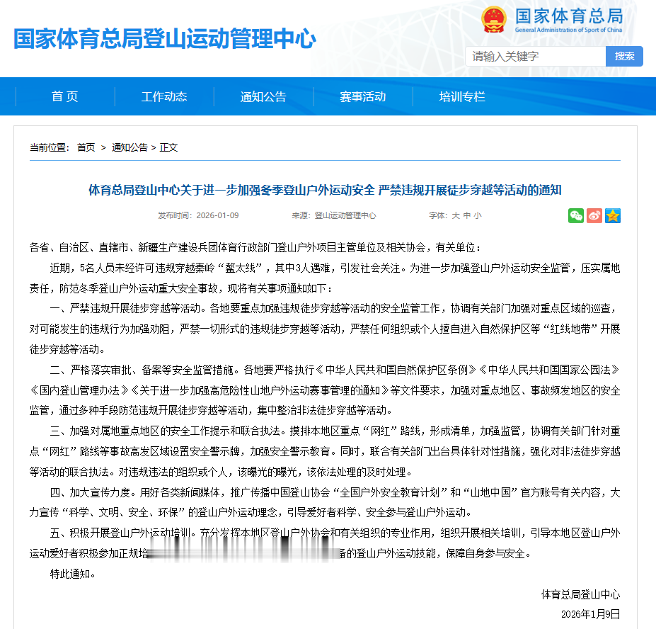 近期,5名人员未经许可违规穿越秦岭“鳌太线”,其中3人遇难。1月9日,国家体育总局登山运动管理中心发布《关于进一步加强冬季登山户外运动安全严禁违规开展徒步穿越等活动的通知》: