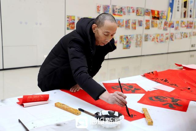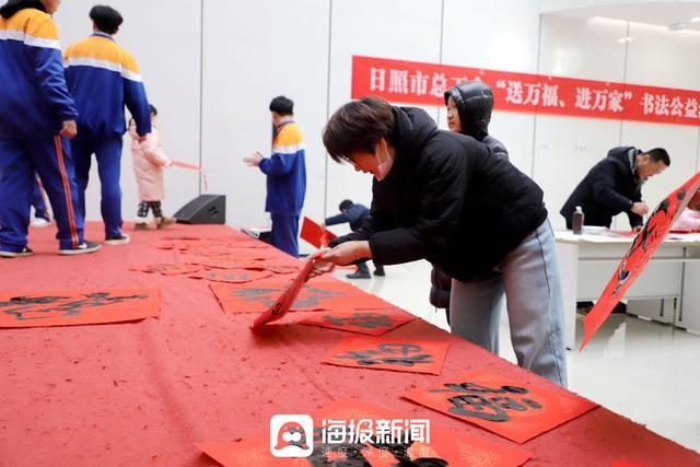 活动一早,日照市工人文化宫内便洋溢着喜庆祥和的氛围。长桌铺开,红纸展就,书法家们凝神聚气,手中的毛笔如行云流水,一个个饱满的“福”字、一副副寓意吉祥的春联跃然纸上。前来领取春联的职工群众络绎不绝,他们围在桌前,欣赏着精湛的书法艺术,挑选着自己心仪的联句,脸上写满了期待与喜悦。