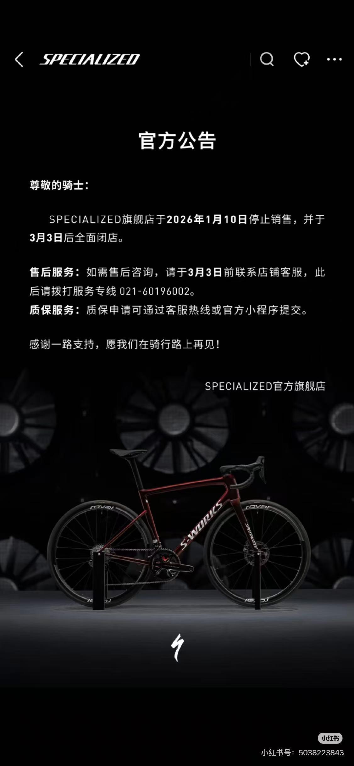 1月10日,国际高端骑行品牌SPECIALIZED(业内常称“闪电”)的京东官方旗舰店发布闭店公告,宣布当日起停止店铺销售,并将于2026年3月3日后完成全面闭店操作。这一调整随即引发国内骑行圈的关注。