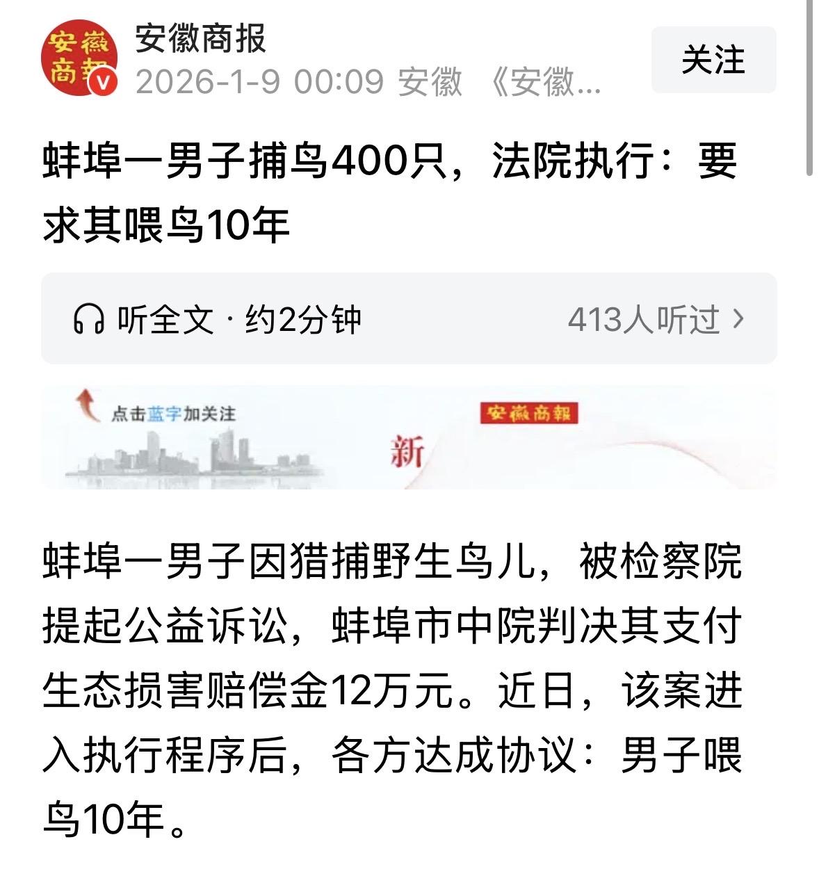 “有温度的判决!”安徽蚌埠,男子在田间捕捉了400多只野生鸟,被罚款12万,可他是个农民,家中一贫如洗,还有2个孩子要养,压根拿不出这么多钱,就在男子一筹莫展时,法院了解到他的难处,便商量出一个“以劳代偿”的法子。他们告诉男子,接下来的10年,他必须每年拿出200斤粮食,撒到树林里喂鸟,喂满10年后,那12万的罚款就一笔勾销。 在乡下,农闲时候有人喜欢捣鼓些抓鸟摸鱼的营生,大家伙可能觉得这不算啥大事,见怪不怪了。 2020年,胡某某也动了心思。 他买来粘网,甚至还配了毒药,在田野里下套。 这一通折腾下来,确实收获不小。什么黑水鸡、斑鸠、麻雀…他林林总总抓了400多只。 当时他心里估计还挺美,觉得这是无本万利的好事,既没花钱又有野味吃。 可这世上没有不透风的墙,更没有白占的便宜。这事儿后来被捅出去了,检察院直接找上门。 人家的说法很硬气,说你抓的不是几只鸡,那是野生动物,是生态环境的一部分。 你这一网下去,破坏的是大家伙儿共有的自然环境。 于是,胡某某被一纸诉状告上了法庭。 法院判决下来,胡某某傻眼了。他得赔偿生态损害赔偿金12万,外加800块鉴定费! 12万啊!对于一个面朝黄土背朝天的农民来说,这简直是天文数字。 判决是下来了,可胡某某拿不出钱。案子很快到了执行局法官手里。 法官去胡某某家里一看,心里也沉甸甸的。这哪是什么富裕人家,简直是家徒四壁。 胡某某说是务农,其实全家就指望低保金过活。大女儿正读大学,正是需要钱的时候。小女儿身体还有残疾,离不开人照顾。 家里除了四面墙,几乎就没值钱的东西。 胡某某坐在那就差给法官跪下了,他说:法官,我知道错了,这钱我该赔,可我家这情况你们也看到了,上哪让我凑齐12万啊! 他那种绝望不是装出来的,是那种被生活逼到墙角、想负责却没能力的无力。 这时候,如果法院硬要强制执行,把人逼死也没用,还可能把这个家彻底推垮。 但这12万的生态损失也不能就这么算了,不然法律的威严何在? 执行团队的法官们开了好几个会,最后琢磨出一招,那就是以劳代偿。 法官跟胡某某商量,说你没钱,但有力气。既然你之前捕鸟破坏生态,现在就用你的劳动来修复生态。钱拿不出来,就用工抵债。 至于具体方案,是这样的:胡某某不用一次性拿12万,但在接下来的10年里,他每年得自掏腰包,或者说用劳动折算,拿出200斤粮食,专门撒到树林里喂鸟。 除此之外,村里的护林、巡山、防火宣传这些活儿,他都得包圆了,随叫随到。 这方案一出,检察院、居委会都觉得靠谱,胡某某更是千恩万谢,只要不让他立马拿现金,干啥都行。 最近,法官带着人去现场监督执行。大家伙儿看到了特别的一幕。 只见胡某某端着一盆金灿灿的玉米粒,一把一把往树林里撒。他撒得很仔细,生怕漏掉一个角落。 以前他撒网是为了要鸟的命,现在撒粮食是为了救鸟的命。 一边撒,胡某某一边嘟囔,以前不懂法,觉得抓几只鸟没啥,现在才知道这是造孽。 对胡某某来说,这或许是他这辈子最漫长、也最深刻的一次普法课。 根据《最高人民法院关于审理环境民事公益诉讼案件适用法律若干问题的解释》第32条规定:发生法律效力的环境民事公益诉讼案件的裁判,当事人必须履行。一方当事人拒绝履行的,对方当事人可以向人民法院申请强制执行。对于被告因经济困难无法履行金钱给付义务的,可以允许其以提供有益于生态环境保护的劳务活动折抵赔偿费用。 这个案子最让人眼前一亮的地方,不在于捕鸟被罚,而在于没钱怎么罚? 通常大家印象里,法院判决赔钱,拿不出钱就得拍卖家产或者被限制高消费,甚至被拘留。 但在这个案子里,胡某某家里一贫如洗,还有两个女儿要养,硬要钱只会把人逼上绝路,而且生态修复的钱也落不到实处。 这个法条明确了一个原则:法律不仅要“罚”,更要“执”,但执行要看实际情况。 如果被告确实穷得叮当响,拿不出赔偿金,法院有权灵活处理。只要你肯干对环境有益的活儿,就能拿工时来抵债。 这在法律上叫“替代性履行”,既解决了执行难,又解决了履行不能的问题。 这个案子里,胡某某破坏了多少生态,就得修复多少生态。他捕了400只鸟,造成的损失折算成钱是12万。 现在让他每年出200斤粮食喂鸟,还要巡山护林,这10年下来,他对当地生态做的贡献,理论上是可以覆盖那12万损失的。 虽然是“以劳代偿”,但不是胡某某随便撒把米就算完了。法条要求法院必须监督。 如果他偷懒、不去,或者敷衍了事,法院随时可以恢复对12万现金的强制执行。 对此,你怎么看? 关注@运良说法 学法律知识不迷路