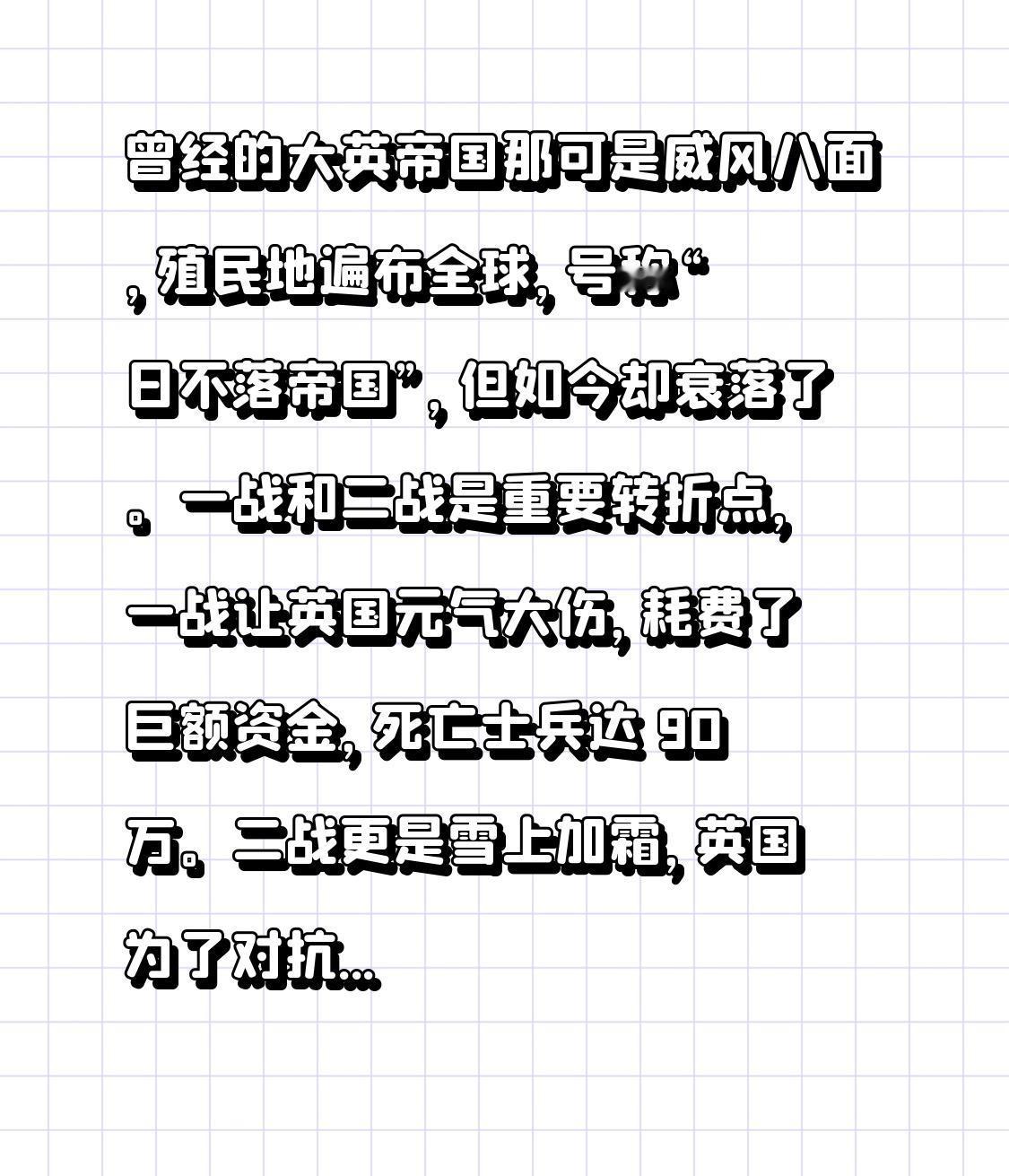 曾经的大英帝国那可是威风八面,殖民地遍布全球,号称“日不落帝国”,但如今却衰落了。一战和二战是重要转折点,一战让英国元气大伤,耗费了巨额资金,死亡士兵达 90 万。二战更是雪上加霜,英国为了对抗纳粹德国,经济全面转向战时体制,战后负债累累,欠美国债务高达 40 多亿美元。 此外,殖民地纷纷独立也让英国失去了大量资源和市场。曾经印度是其重要殖民地,每年能为英国带来巨额财富,可印度独立后这笔收入就没了。加上新兴国家崛起,全球经济格局变化,英国逐渐失去了经济优势,就一步步衰落到如今的地步了。