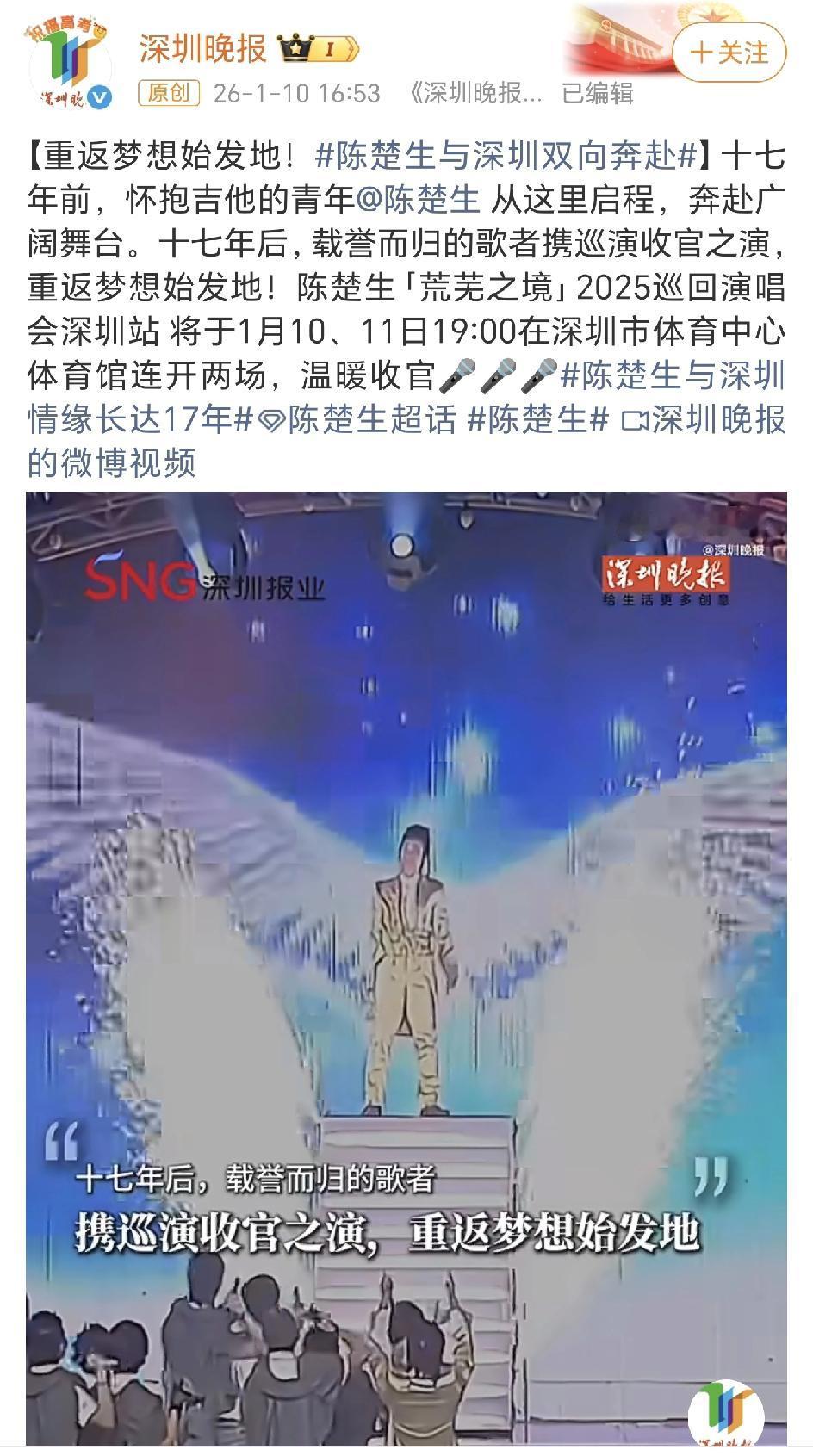 陈楚生深圳演唱会排面好大,深圳晚报发了陈楚生的短片,从深圳酒吧驻唱到中国新闻周刊影响力音乐人,他走了18年! 载誉而归的歌者携巡演收官之演,重返梦想始发地! 深圳是他梦开始的地方,短短几十秒,2007快男冠军,披荆斩棘冠军,歌手冠军~这一路的艰辛终于都值得了! 演唱会现场好多鲜花,全国各地的粉丝都送来了花篮,收官演唱会是花生们的狂欢节!陈楚生