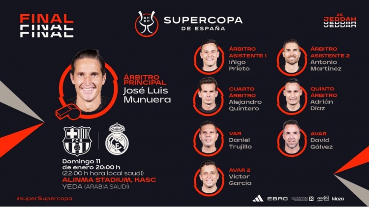 直播吧1月10日讯西班牙足协官方公布了西超杯决赛裁判安排情况,主裁判为何塞·路易斯·穆努埃拉。
