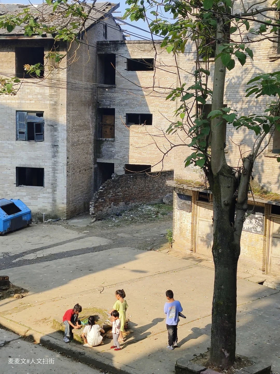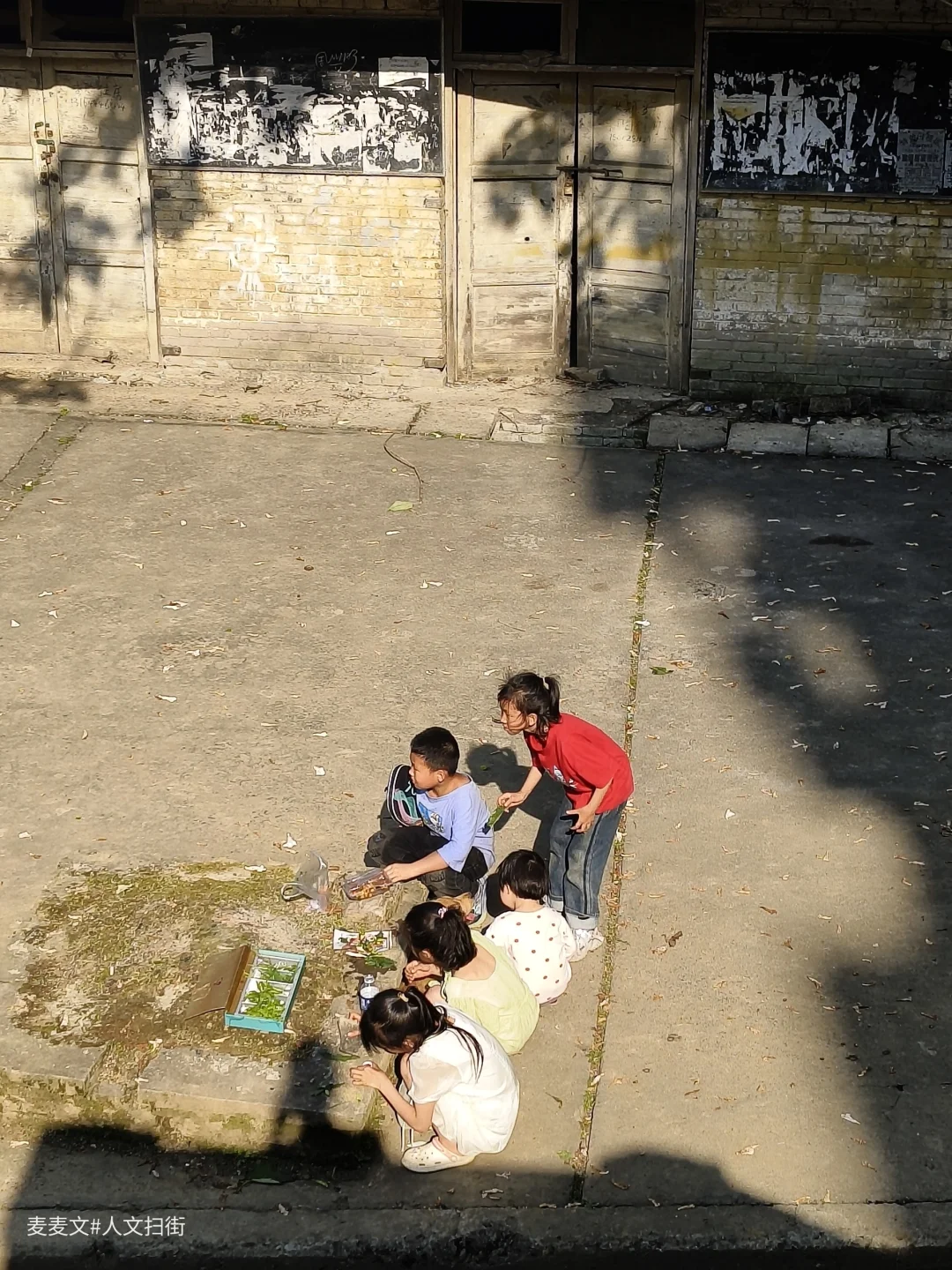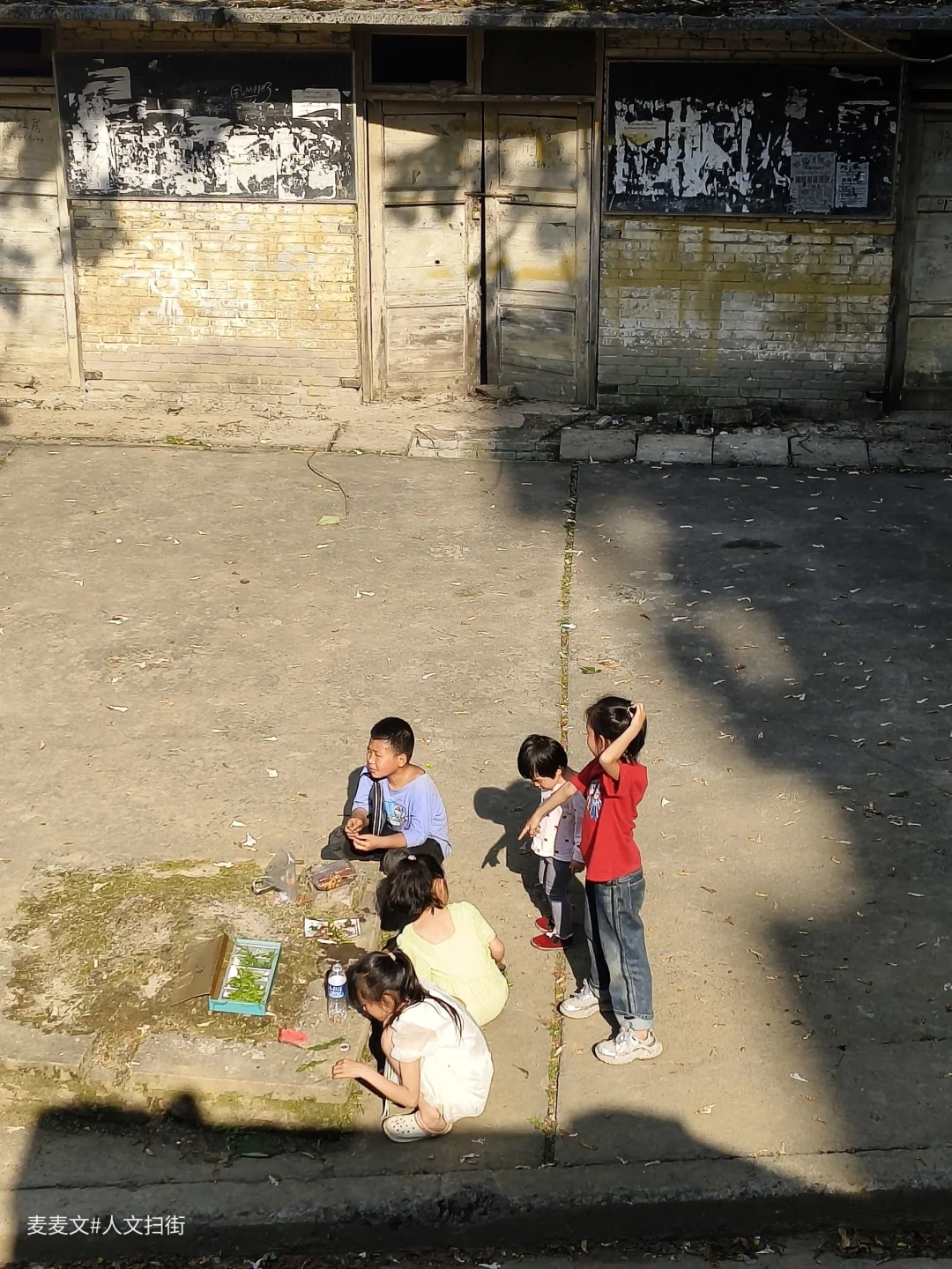 傍晚的阳光斜斜切过砖墙,在褪色的水泥地上投下几何状的明暗拼图。五个孩子如同散落的积木,在这幅天然画布上,搭建着属于他们的微观世界。那些被阳光拉长的影子,既是那个年代投下的历史注脚,也是永不褪色的童年剪影。