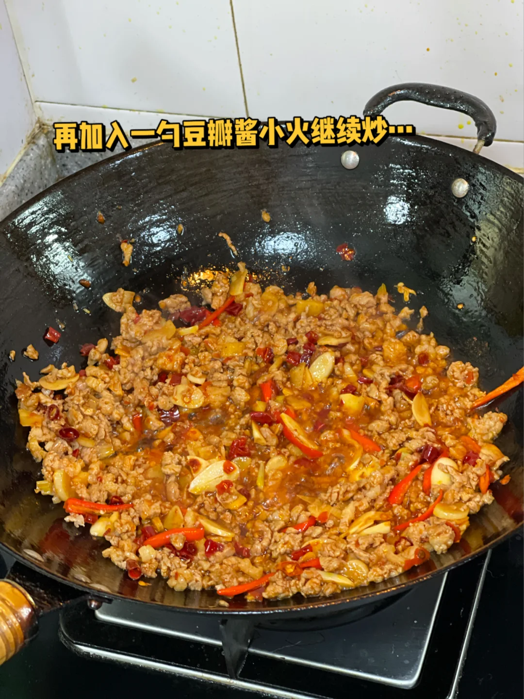 5一大勺豆瓣酱丢进去继续小火炒出红油,这样才会香