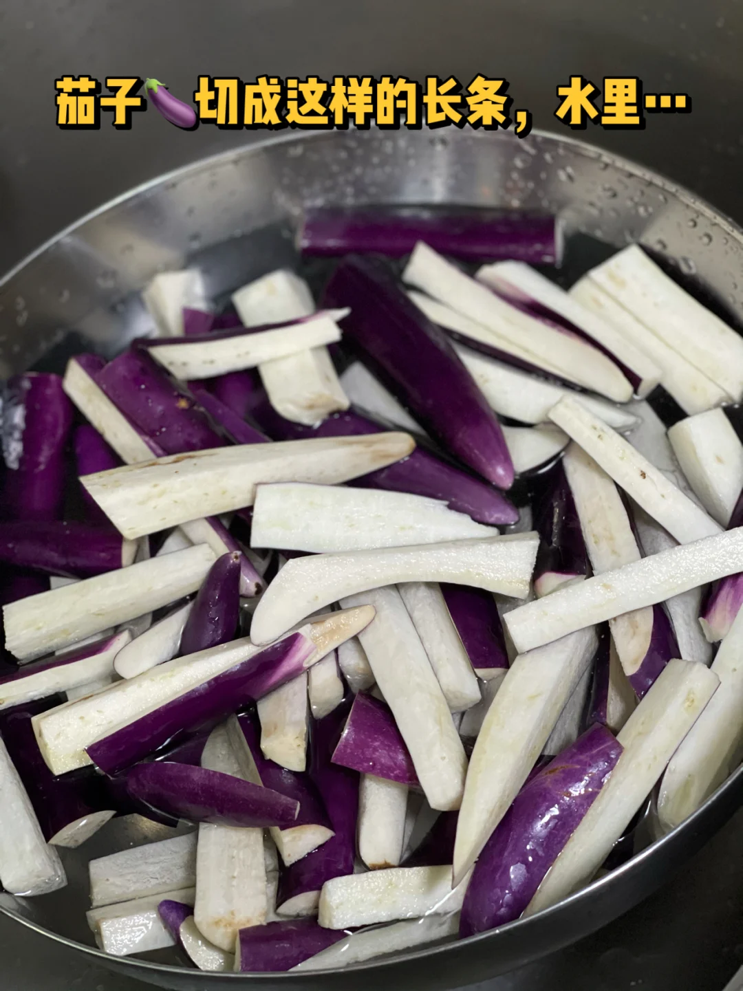 2.茄子切长段,滚刀块都行,别太细,水里放少许盐,白醋茄子丢进去浸泡一下,这样不会变色