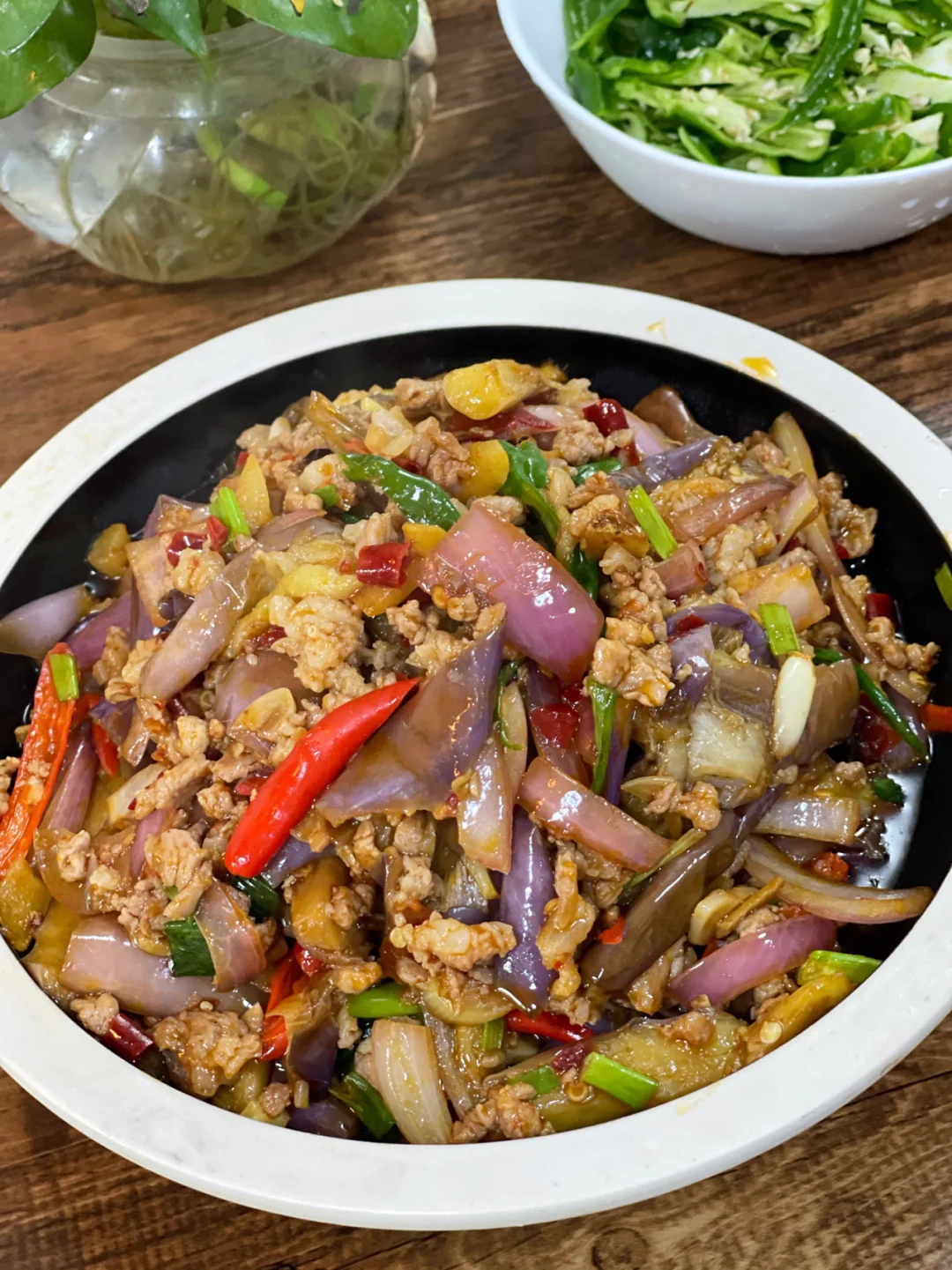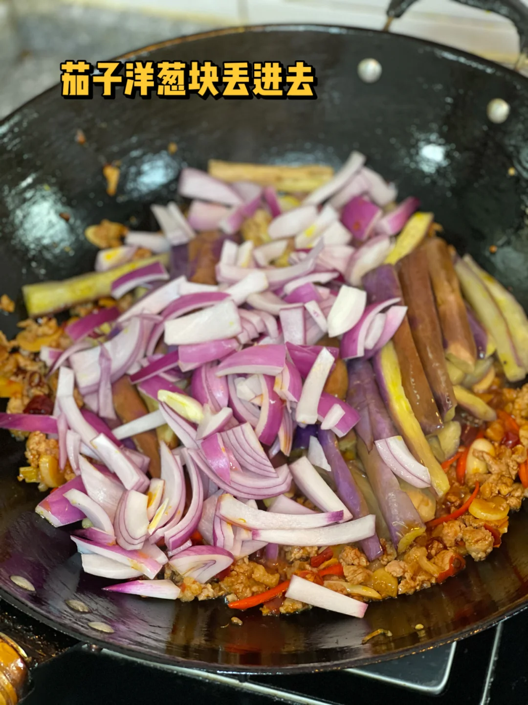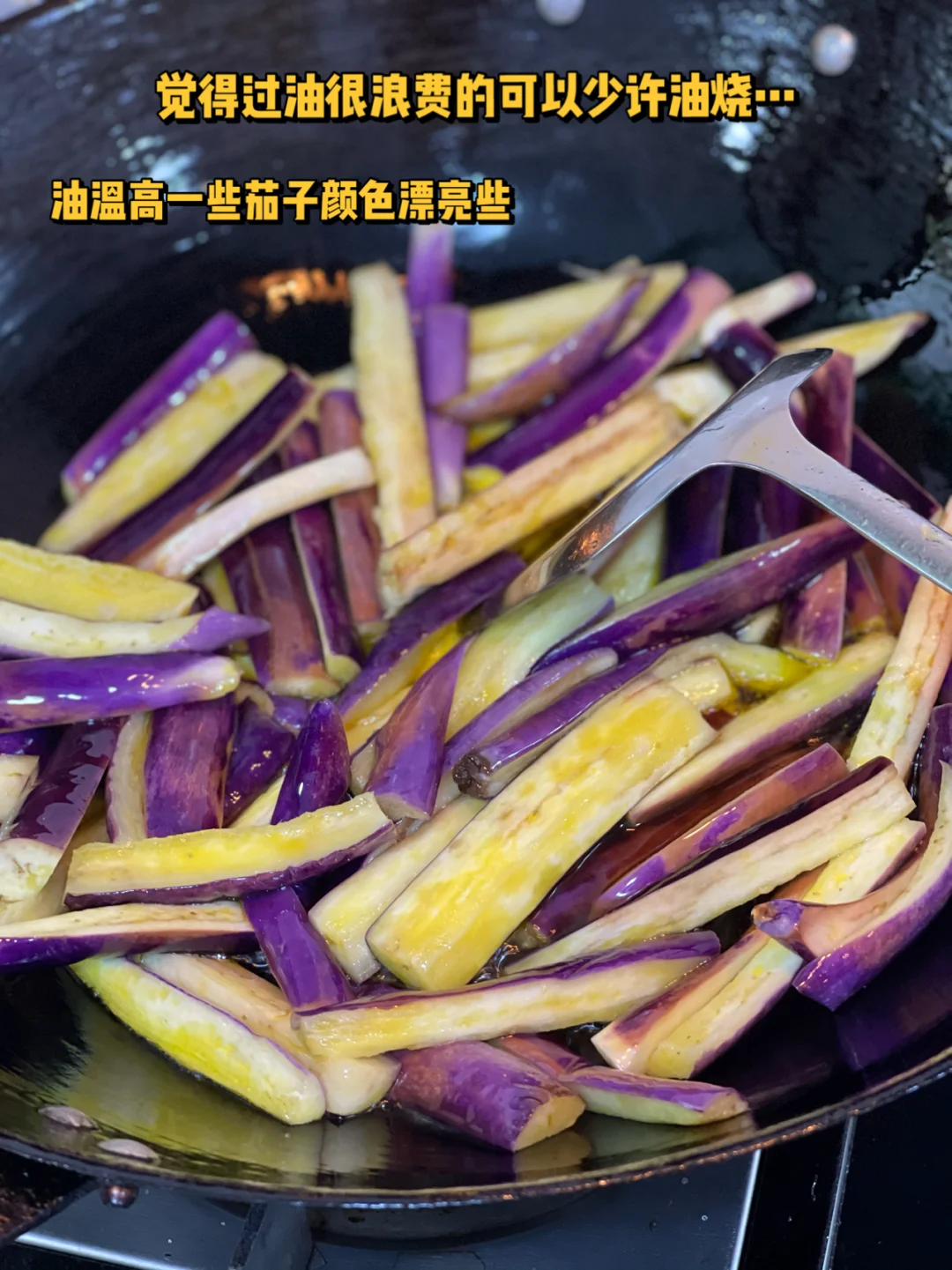 3.以前都是油里炸一下,油温高一些丢进去茄子颜色才会漂亮哦,今天我是少许菜籽油烧热一些茄子丢进去翻炒至五成熟,捞起来待用,这样省油哈哈