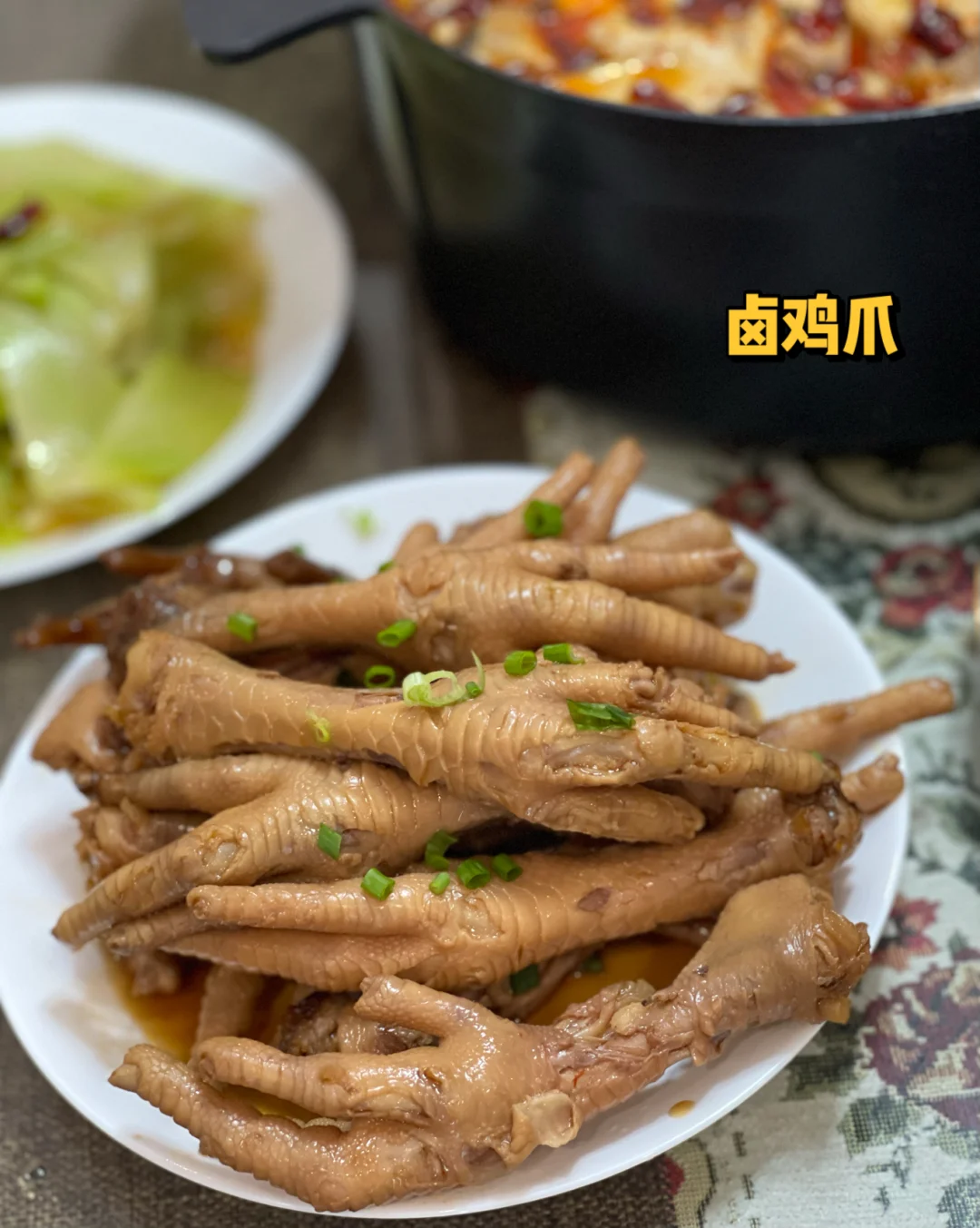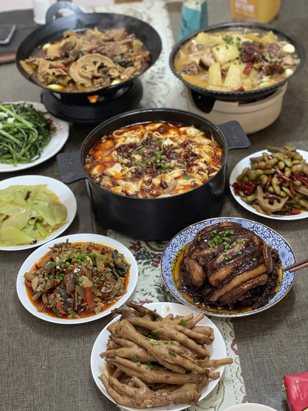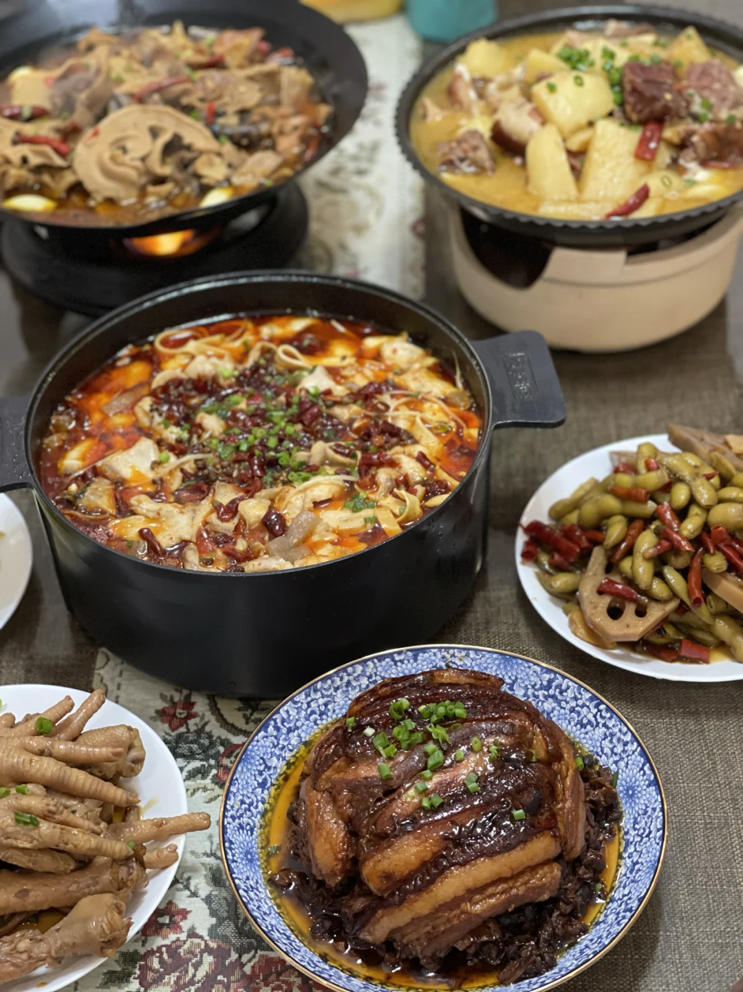 很多人都会觉得做一桌子菜太费时间了,主要我家锅多操作起来顺手、两个砂锅一个煤气灶一个电炖,一个蒸炖锅两层一层蒸米饭一层蒸扣肉,鸡爪毛豆前一天晚上卤一会儿再焖一个晚上会更入味儿样子也更好看