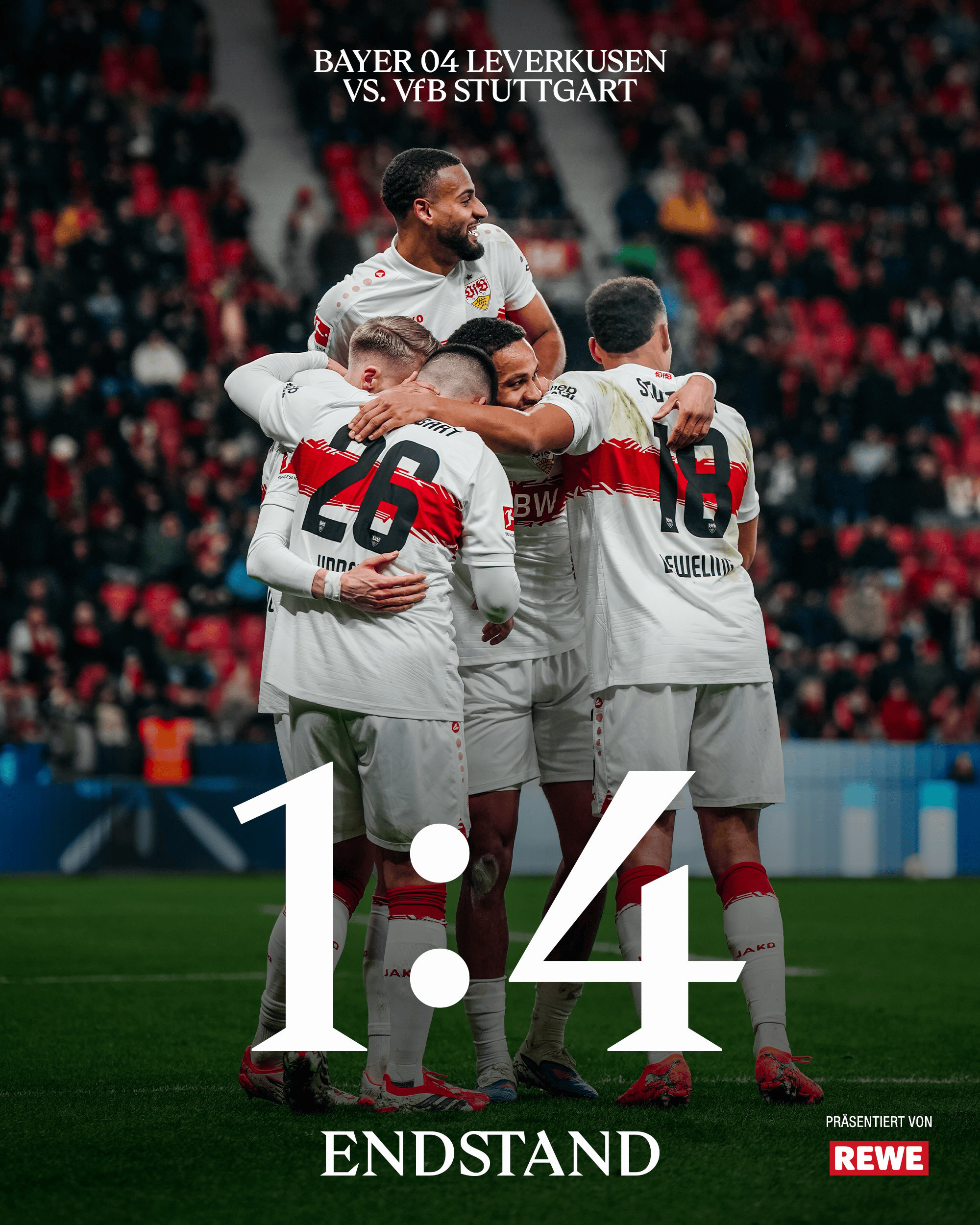 中场休息结束后,尤尔曼德换上了波库和巴代,勒沃库森的场面也有所改善并在第66分钟制造点球由格里马尔多主罚命中。但斯图加特采取守势后勒沃库森破门乏术,最终他们还是在主场1-4落败。