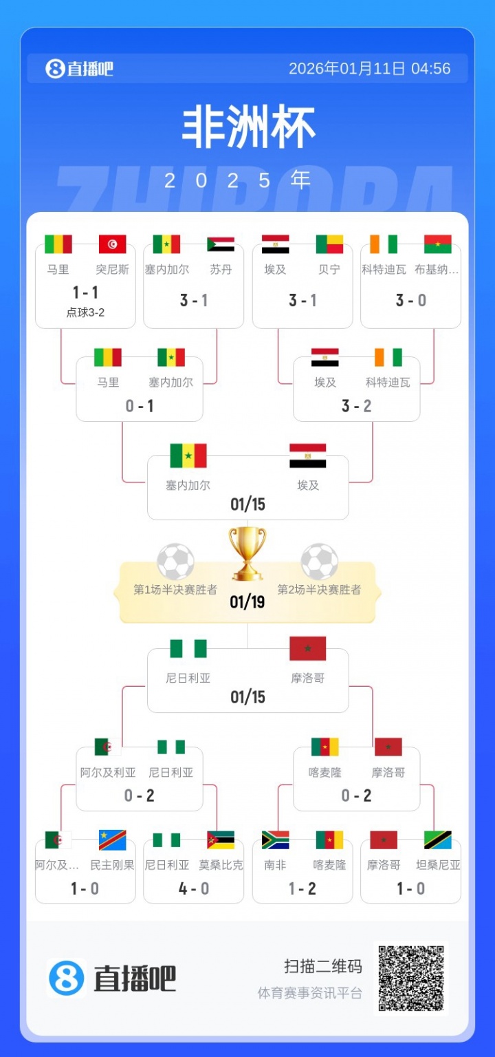 直播吧01月11日讯非洲杯1/4决赛战罢,本届赛事四强全部确定:塞内加尔、摩洛哥、尼日利亚、埃及。半决赛将在1月15日开战,具体赛程如下: