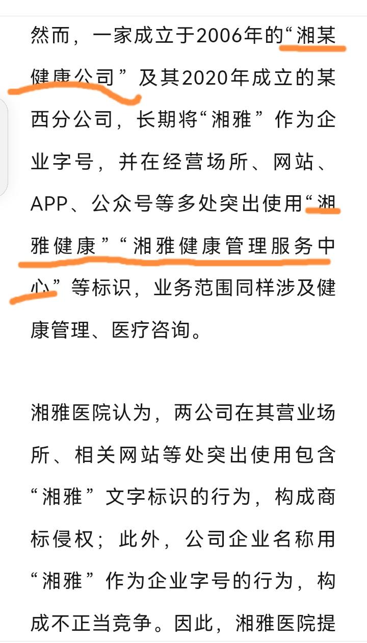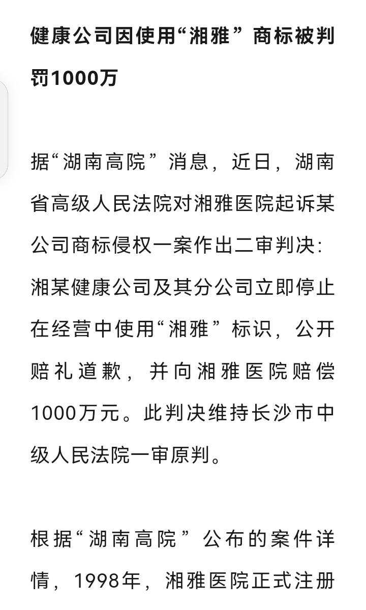 两个字,1000万!啥字这么金贵?——湘雅。 没错,就是你想的那个“湘雅医院”的湘雅。最近湖南高院判了,一家公司未经许可在经营中使用“湘雅”标识,被判立即停止使用、公开道歉,还要赔给湘雅医院整整1000万元(详见附图)。 呵呵,一个字500万!这哪是字,简直是镀了金的招牌。 湘雅医院百年老院,名字背后是口碑和信任。别人随便拿来用,消费者容易混淆,这侵权确实不该。法院这判决,赔的是钱,护的是品牌价值,更给所有企业提了个醒:傍名牌、蹭名号的路,走不通了。 所以呀,给公司起名别光想“蹭热度”,还是得脚踏实地。不然一不小心,可能赔掉一套房!湘雅医学 湘雅大医院 中南湘雅二医院 湘雅2院