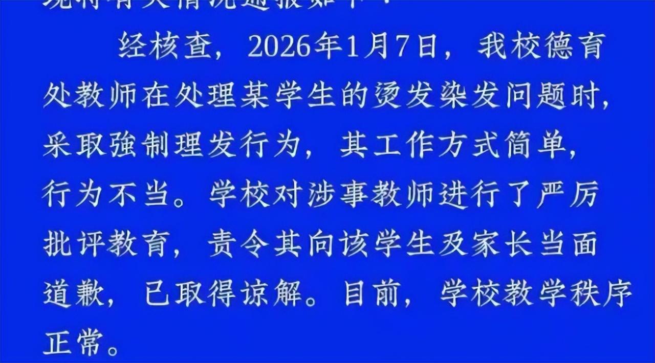 一体两面探讨“重庆某中学暴力剪发”事件 一体两面的讨论,换个说法,一件事情像一把双刃剑:有好的一面,也有坏的一面。 所以,用单一的,偏激的,过于主观的去认识一个事物,总是不全面的。 所以,一体两面,也可以理解为唯物辩证法(中庸)——要辩证的,在具体的客观条件下去分析一个事物。 而唯物辩证法的底层基础,可以用《矛盾论》这话来概括 “一切对立的成分都是这样,因一定的条件,一面互相对立,一面又相互联结、互相贯通、互相渗透、互相依赖,这种性质,叫做同一性(一体两面)。” 好,我们来一体两面的分析,分析“重庆某中学暴力剪发”。 第一 为什么要对对学生发型作硬性规定? 这跟学校统一穿校服,底层逻辑是一样的:减少孩子攀比心,营造一个让学生更专注学习的环境,预防早恋。。。 第二 为什么不能多元化? 可以多元化,有些人是不是觉得这个拐弯有点大? 家长愿意,可以把孩子送贵族学校、国际学校、创新学校。。。很多这些学校不仅不对发型硬性规定,还鼓励孩子穿出自己的个性。 第三 矛盾在哪里? 在一个公立的,提供全民义务教育服务,培养接班人的学校,学校有学校的行为规范要求。家长如果支持学生的个性化、多元化,那家长不能把个人的主观意愿,强迫其他绝大部分在这方面没有个性化需求的学生、家长接受——沉默的大多数。 你不能既要还要。 第四 你说你想保持个性,但是不想花这个钱,有没有办法? 有,你可以在暑假自由的飞翔,也可以带假发去做百变造型。。。总之,办法比困难多——但是,你不能把个人意志凌驾在其他人之上。 第五 有人说这些老师太暴力了 1 一般学校这种规定都有缓冲期——命令发布,几号之前必须自己去剪,否则,学校会安排; 2 这个学生说,自己回去剪——你信吗?这跟酒驾跟交警说,我明天去队里交罚款,几乎一个意思:饶过我。 3 为什么要强力制止?——现在头发的事情管不了,后面抽烟管吗?打架管吗?带管制刀具,管吗?。。。防微杜渐大体就这个意思。 国家有国家的暴力机关,学校有学校的强力部门,你敢说你没动手打过自己孩子? 第六 如果我是校长 我要是校长,这个事情舆论淡下去。 我得杀鸡儆猴——我得劝退几个刺头的学生,或者让他们转学。 我得论功行赏——我得给几位老师发奖金,给休假,挂红花。 为什么? 舆论吗,有时候就是乌合之众——扯不清,也太废精力。 回到这一亩三分地,要想让大部分学生安心学习,让教师队伍能敢于担当,那就得拿几个人来立威——否则,学生要百花齐放了。