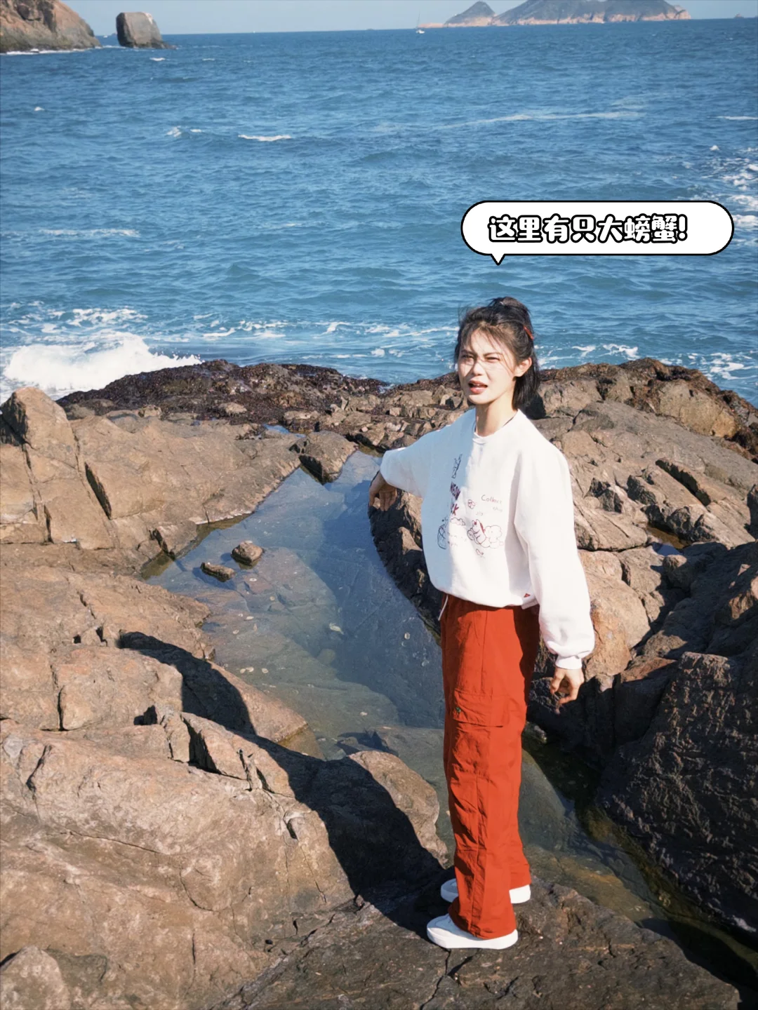 在礁石上随手捉了只小螃蟹,