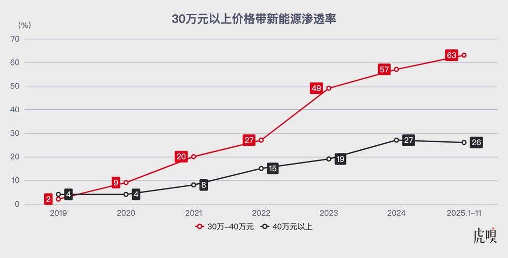 最近几年,国内新能源汽车品牌仰攻高端市场已经成为汽车行业的主流叙事之一。在30万-40万元的价格带,新能源渗透率在六年间攀升了超30倍。