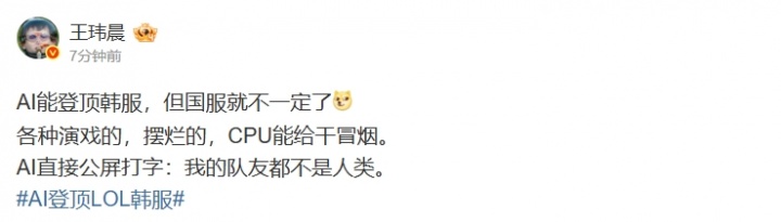 直播吧1月11日讯今日,疑似英雄联盟“Ai玩家”以超高的胜率登顶韩服,对此电竞博主“王玮晨”更博调侃:AI能登顶韩服,但国服就不一定了!各种演戏的,摆烂的,CPU能给干冒烟。AI直接公屏打字:我的队友都不是人类。