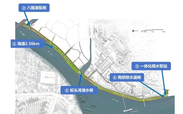 由于所处位置属于河口三角洲地貌,河网密布、潮位变化显著,项目以“外防潮、内排涝”为设计原则,构建多层次防御体系,将新建海堤2.36公里,拆除重建蛇头湾涌水闸、南部排水涵闸,新建八围涌泵站1座和一体化雨水泵站,并配套市政道路、园建设施、绿化工程等,设计防洪(潮)标准为200年一遇。