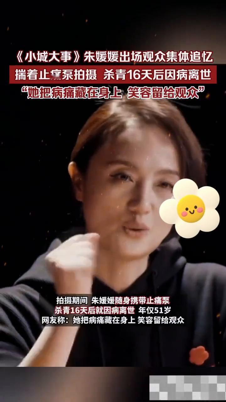 《小城大事》朱媛媛出场,观众集体追忆,揣着止痛泵拍摄杀青16天后因病离世。 1月10日电视剧《小城大事》迎来首播,离世8个月的朱媛媛在剧中饰演高雪梅,角色登场后引发无数观众集体追忆。 剧中朱媛媛饰演的高雪梅带领农村绣娘创业,推动经济发展,以坚韧独立的女性形象展现时代变迁中的奋斗精神与人文温度。拍摄期间朱媛媛随身携带止痛泵,杀青16天后就因病离世,年仅51岁。网友称:她把病痛藏在身上,笑容留给观众。 据悉朱媛媛抗癌近5年期间拍摄了《海洋传奇》、《我的姐姐》等5部作品,留下了诸多精彩片段。