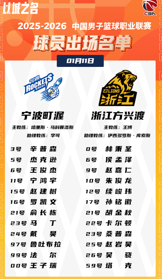 虎扑01月11日讯今晚CBA常规赛,宁波对阵广厦的大名单已经公布。
