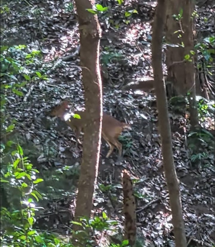 “北高峰FKT偶遇黄麂!刷了三天环西湖路跑,惊喜是,在老和山附近偶遇黄麂!听好些跑友说在西湖群山见过,我有所期待,可没想到就在主路边上就能见到,自顾自的觅食。”