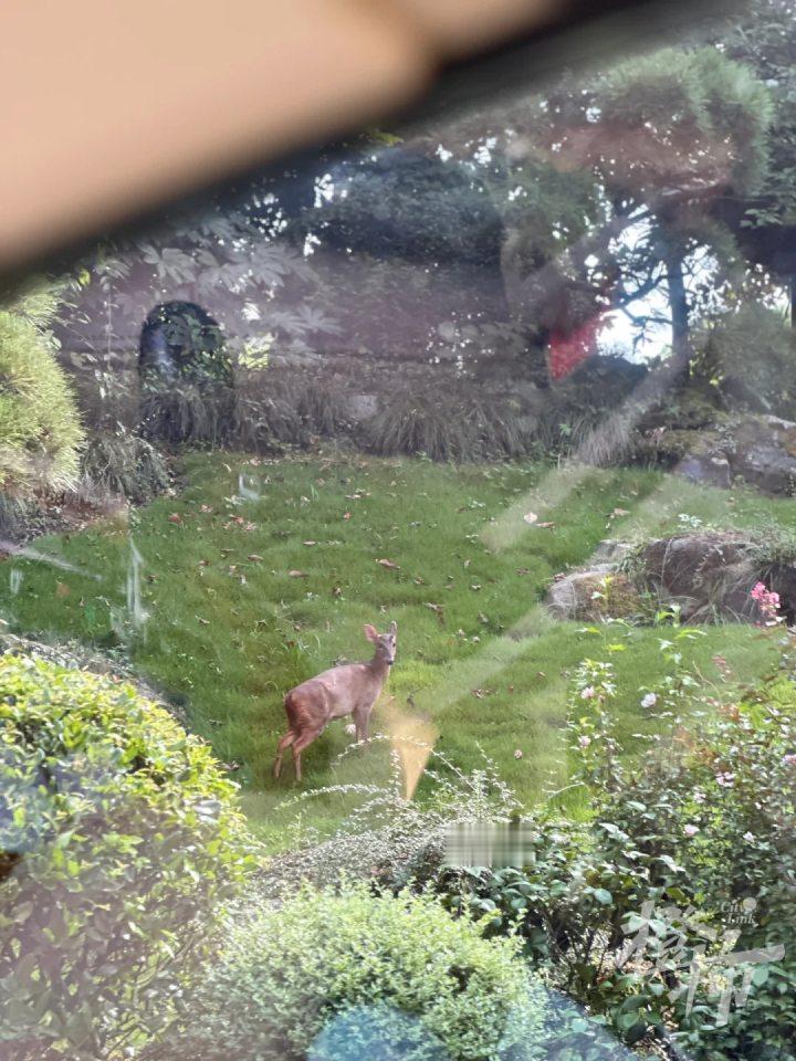 “杭州生态绝了,虎跑公园看见了野生麂子,去虎跑公园打山泉水,路上看到了野生麂子在路边吃草,幸运!”