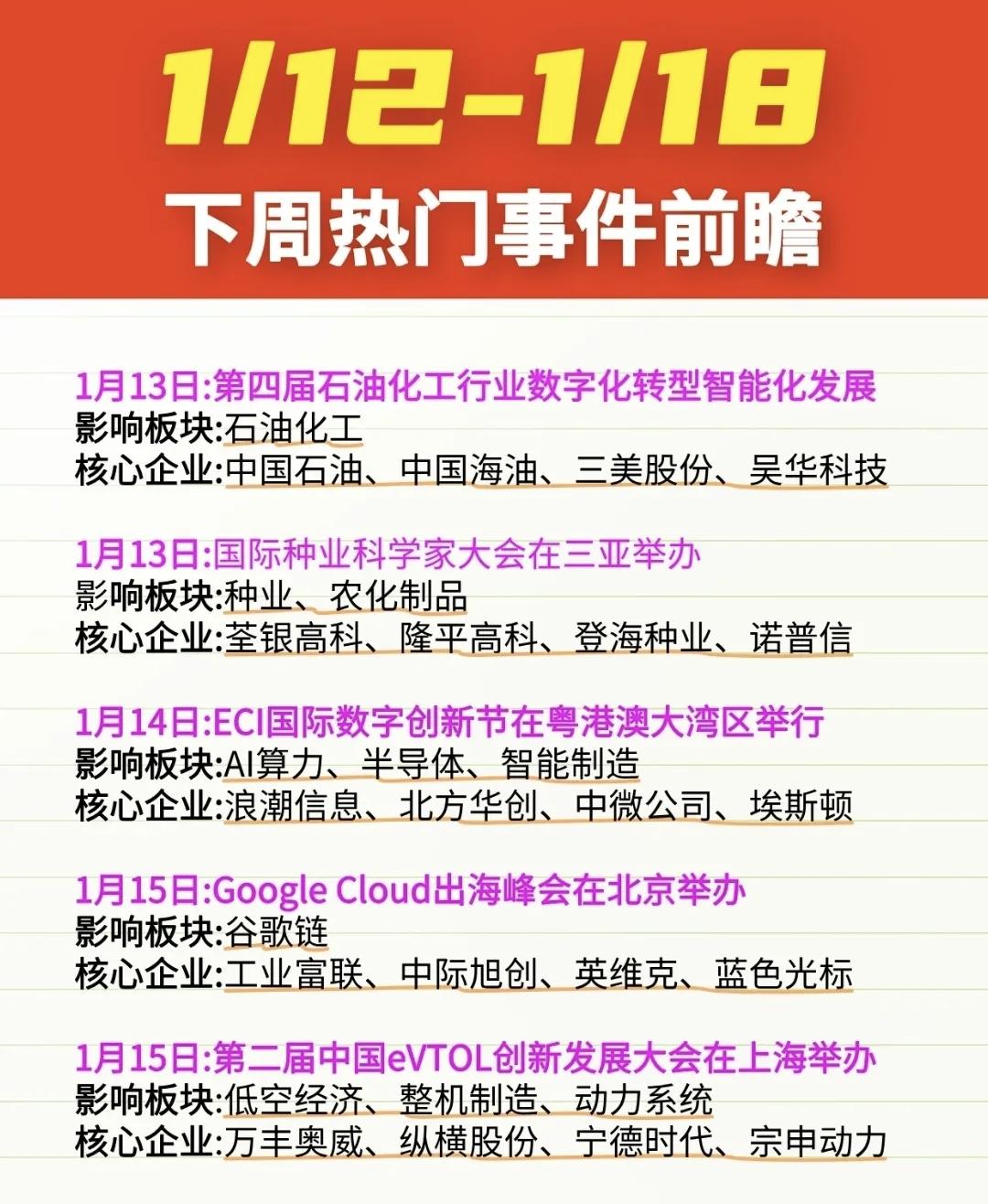 下周重要财经事件前瞻:石油化工数字化、国际种业大会、低空经济、AIGC开发者大会等密集来袭,AI算力、谷歌链、宠物经济、汽车出海等热点轮动不停。 1月14日:ECI国际数字创新节在粤港澳大湾区举办。关联科技方向AI算力、半导体、智能制造等等。 1月17日:第五届AIGC中国开发者大会(北京)关联科技方向有AI芯片、AIGC、AI应用、智能家居。 1月18日:智联6GxAI引航技术峰会(北京),关联科技方向通信设备、卫星通信、射频芯片。核心企业代表中兴通讯、烽火通信、中国卫通、国博电子等等。 理财有风险入市需谨慎!