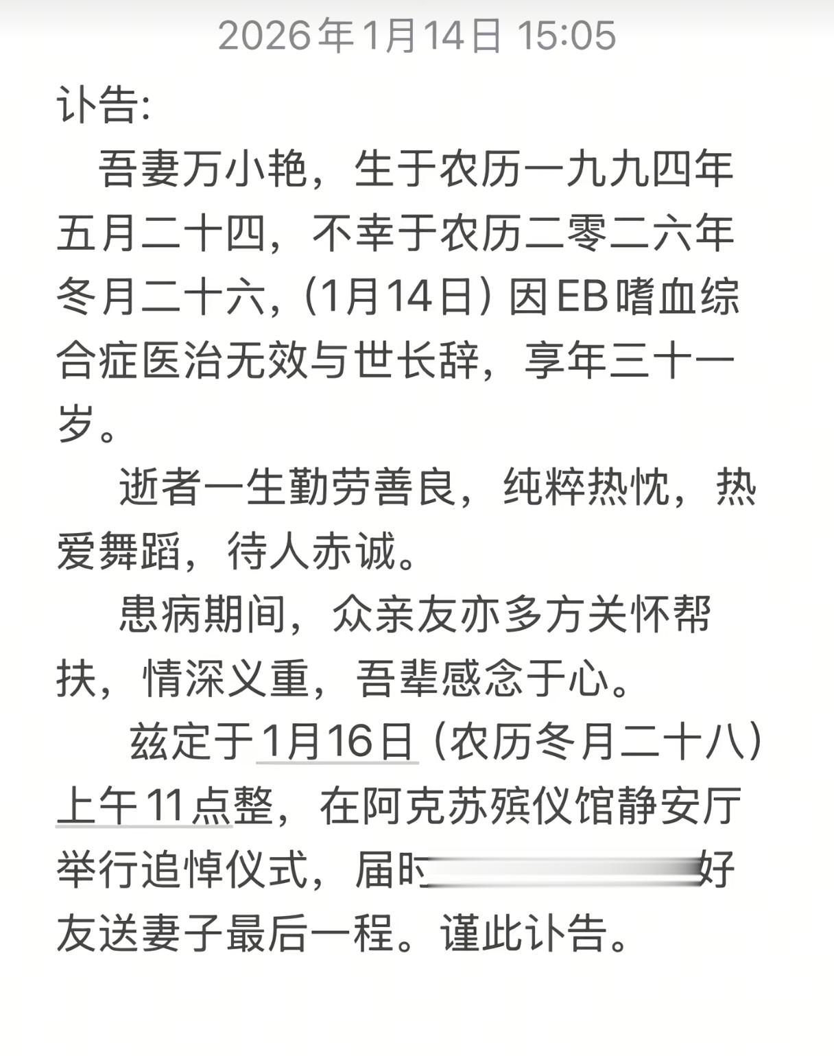 从2025年10月底确诊,到2026年1月14日丈夫发布讣告,不过短短三个月。