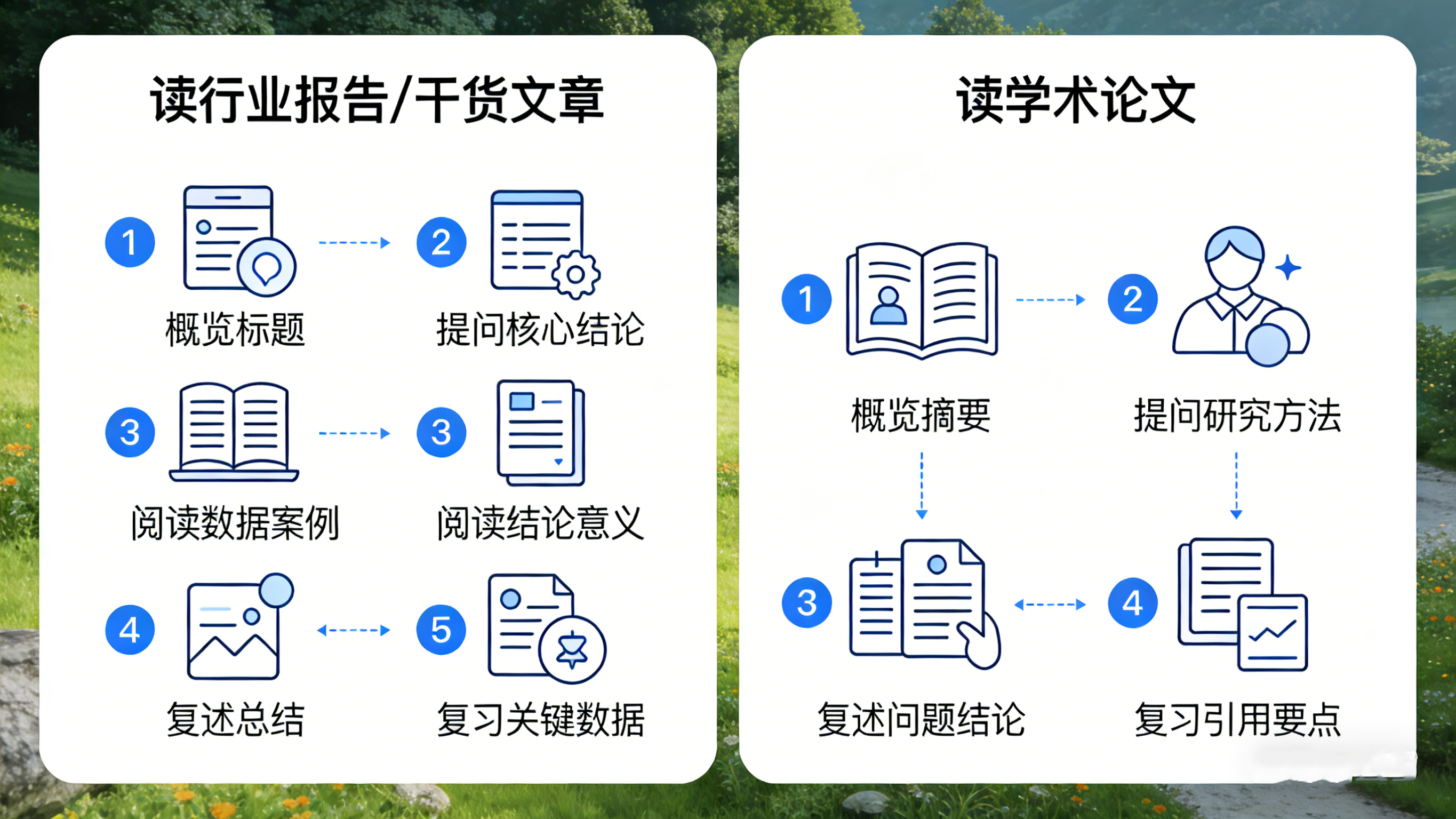 读行业报告/干货文章:① 概览:快速看标题、副标题、目录/小标题,5分钟摸清核心框架;② 提问:比如“这份报告的核心结论是什么?”“有哪些数据能支撑这个结论?”;③ 阅读:重点读核心结论、数据支撑、案例分析部分;④ 复述:用1句话总结报告核心内容,写在笔记里;⑤ 复习:读完后当天晚上回顾1次,3天后再看1次,避免忘记关键数据。
